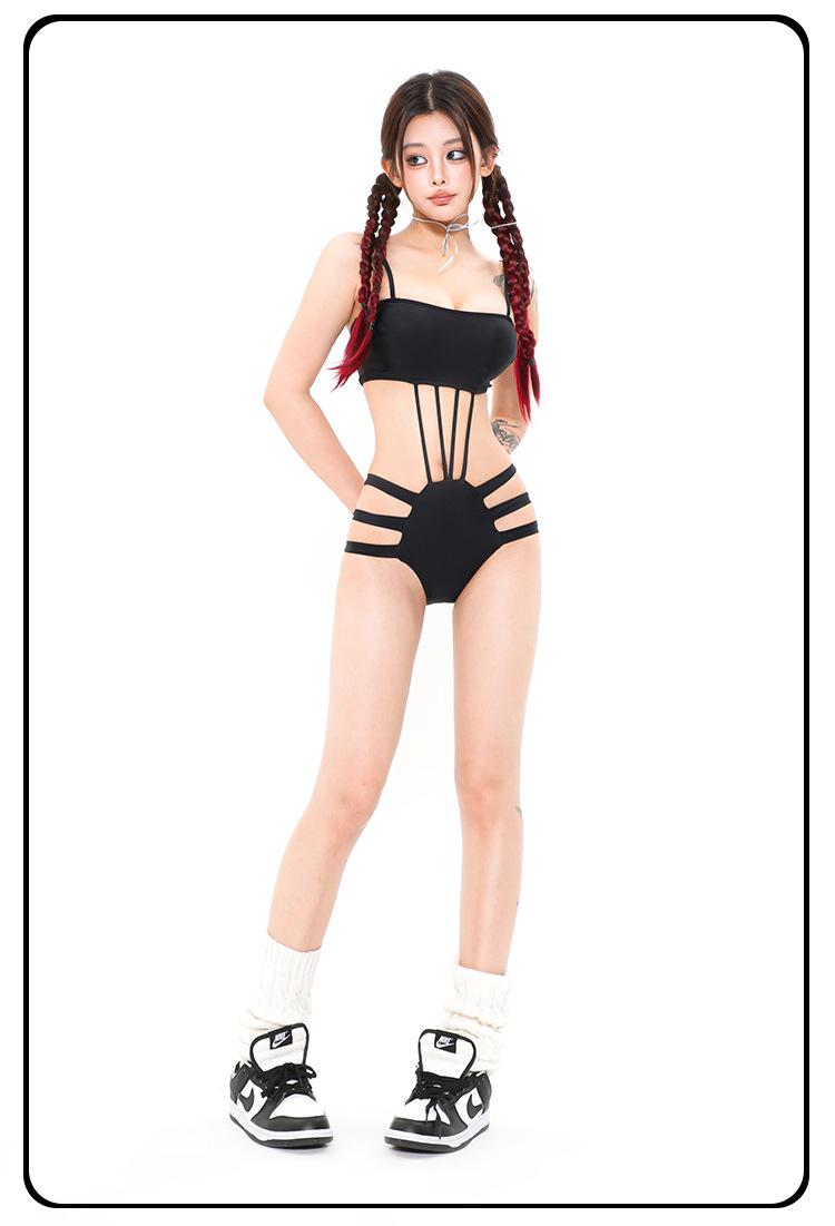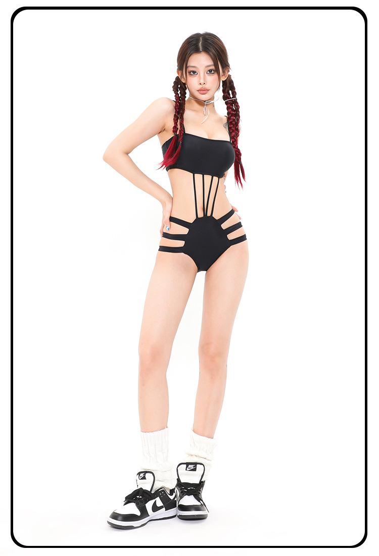 Traje de baño súper sexy para mujer, bikini de una pieza con múltiples cuerdas, cintura abierta, top de tubo dividido, estilo europeo y americano, traje de baño de vacaciones rojo de red, aguas termales
