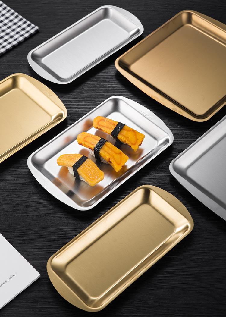Plato cuadrado de acero inoxidable 304, bandeja rectangular de estilo coreano, plato para barbacoa, plato plano dorado para aperitivos.