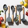 Juego de 5 utensilios de cocina de silicona, espátula de cocina de acero inoxidable con mango de madera, cuchara, utensilios de cocina para pesca