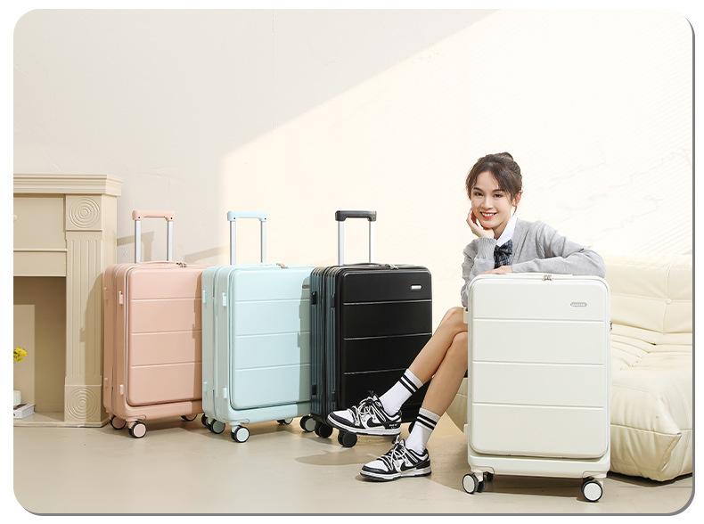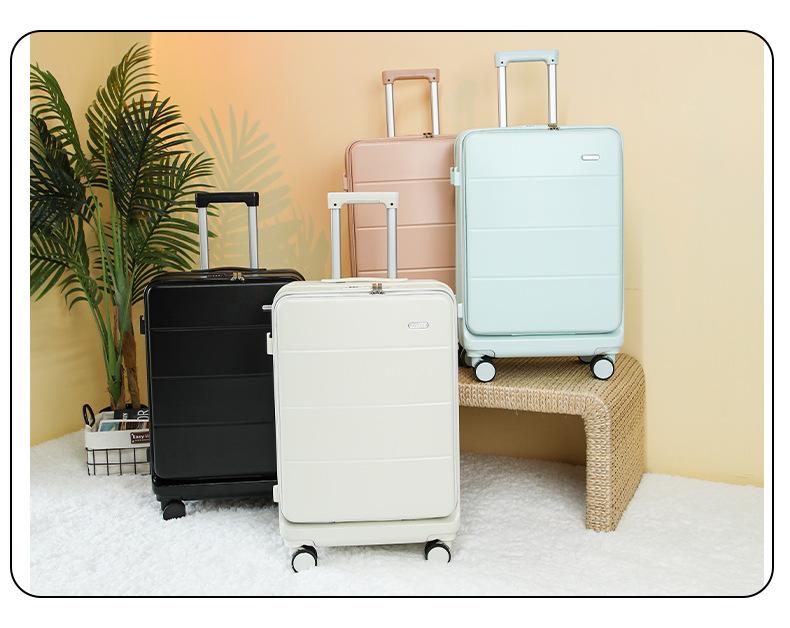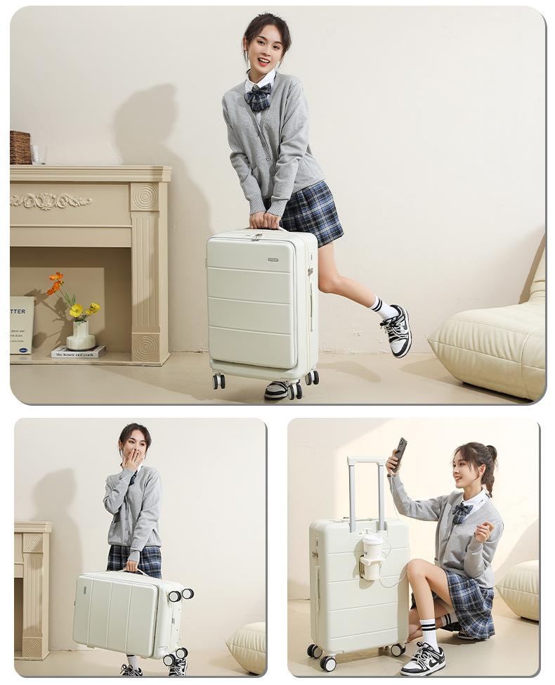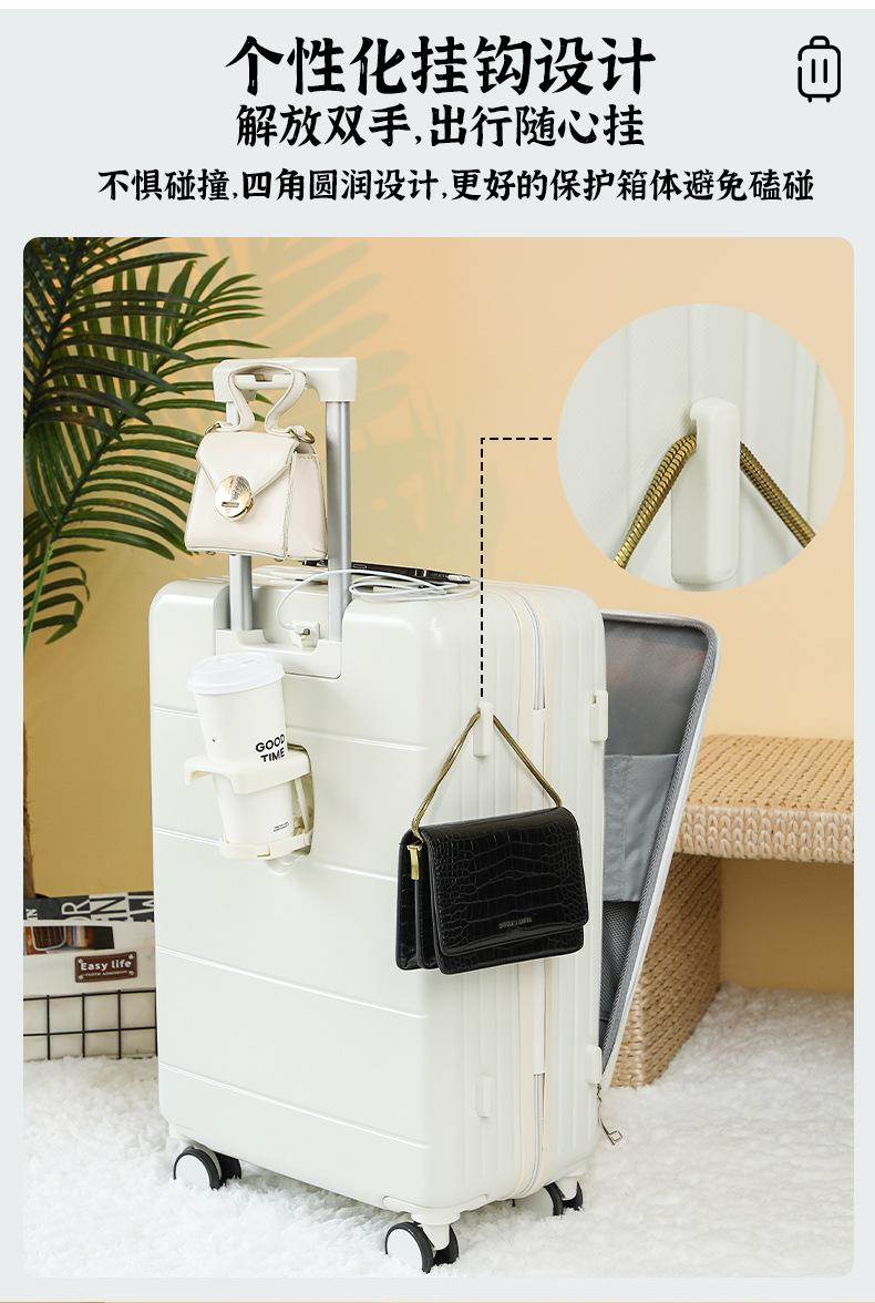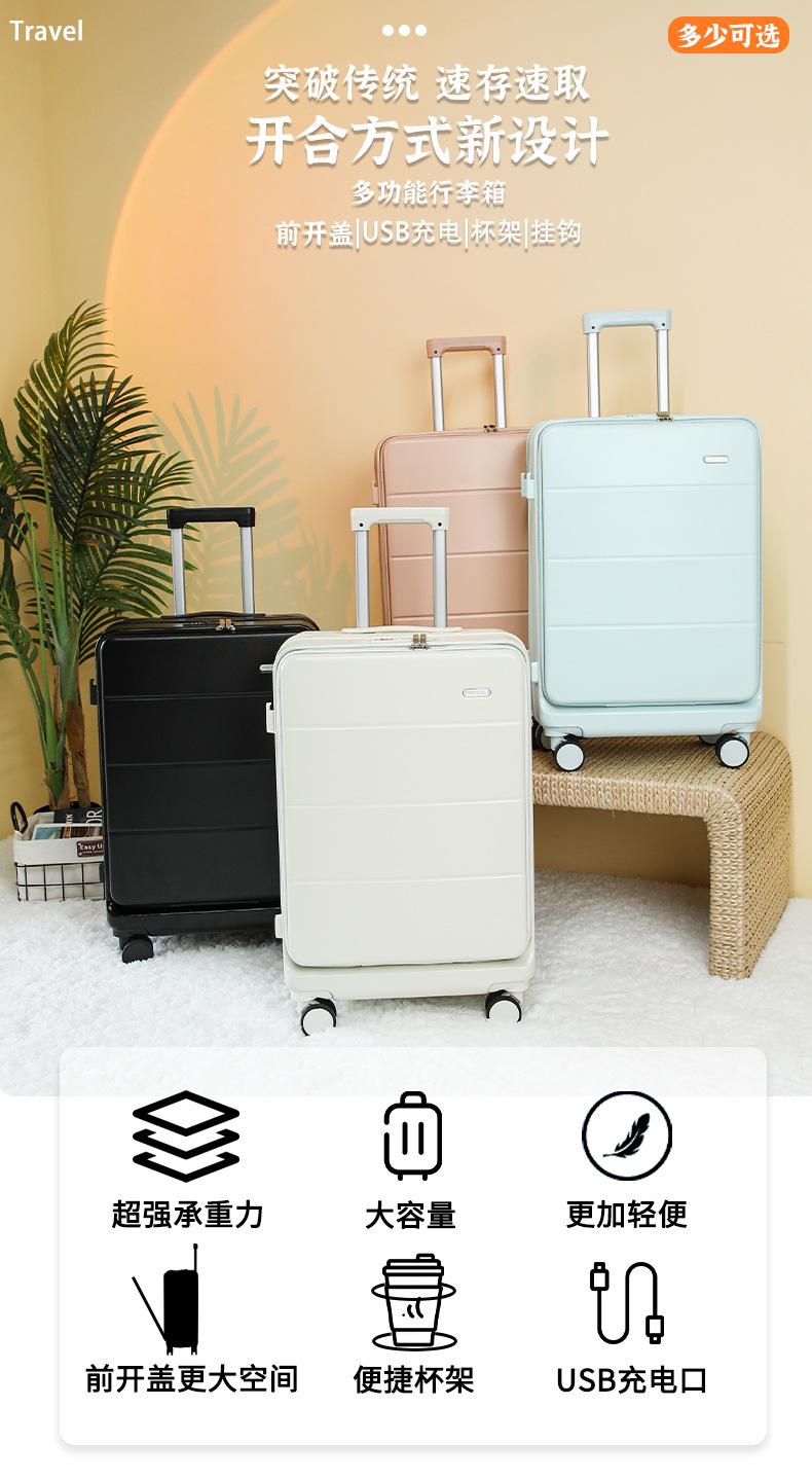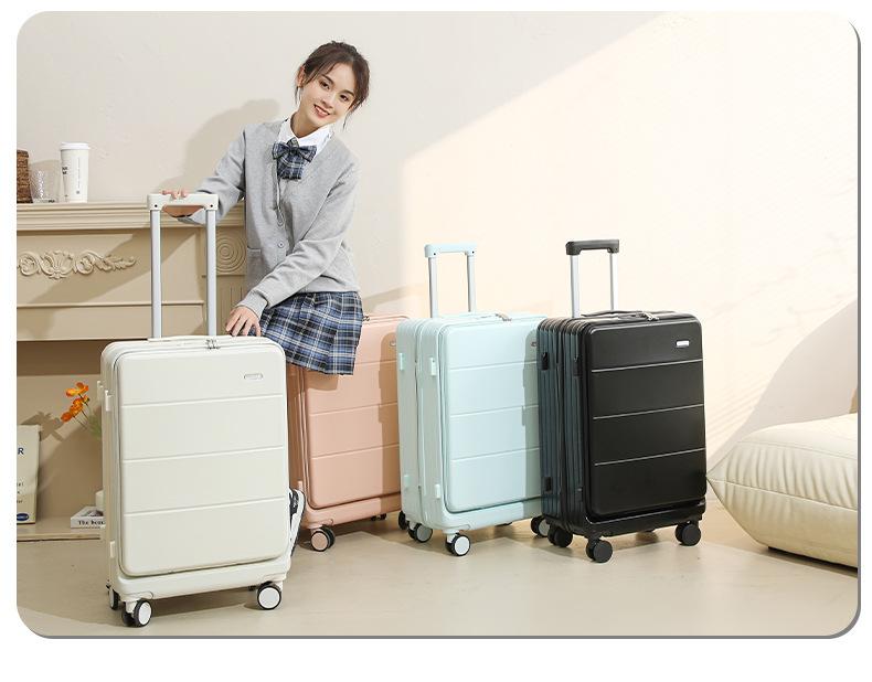 Equipaje de apertura frontal con función completa de 20 pulgadas portavasos con interfaz USB maleta trolley con rueda universal 26 caja de viaje con contraseña