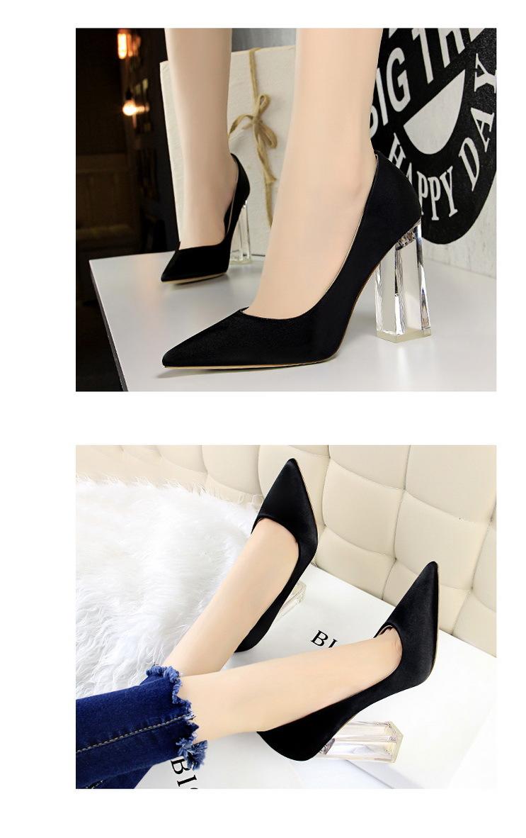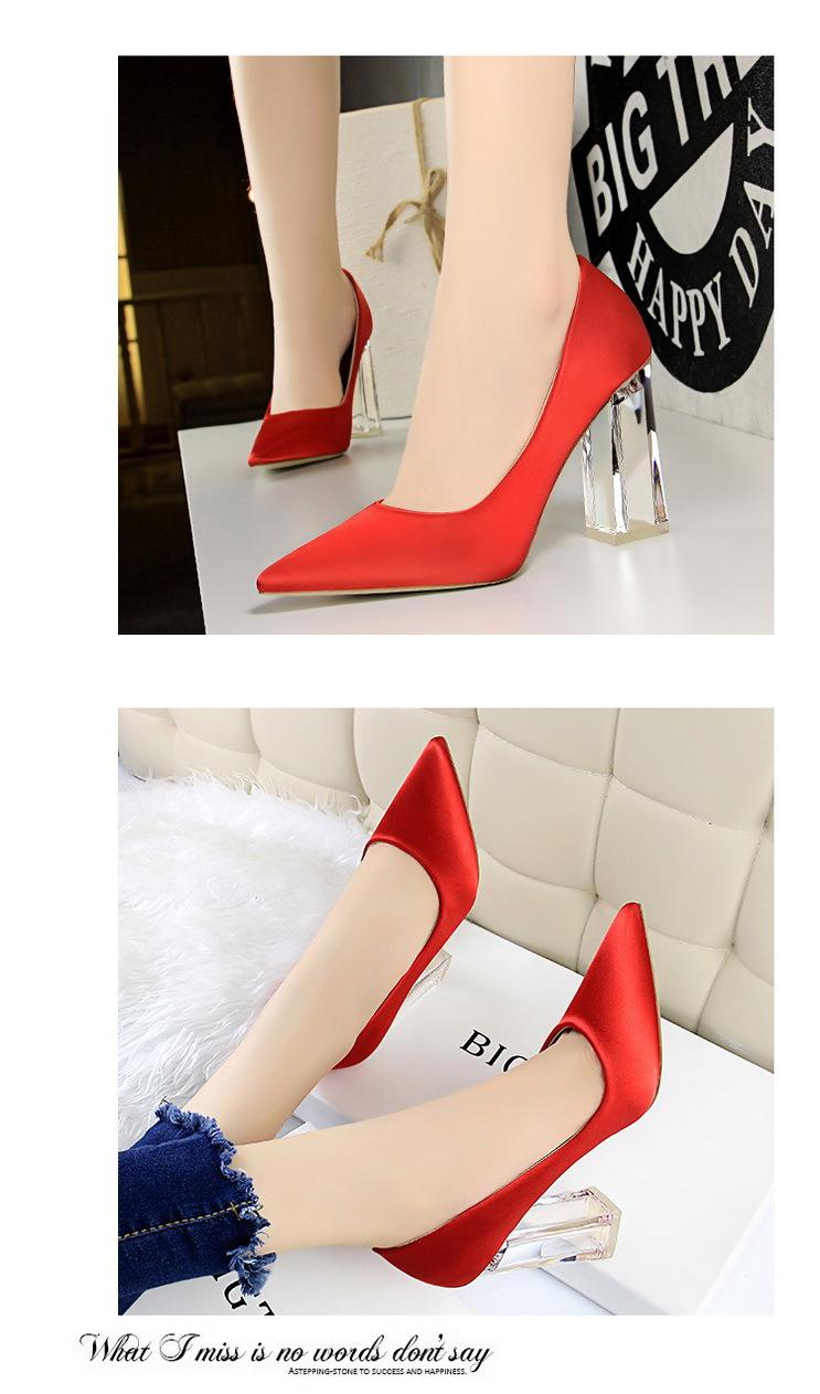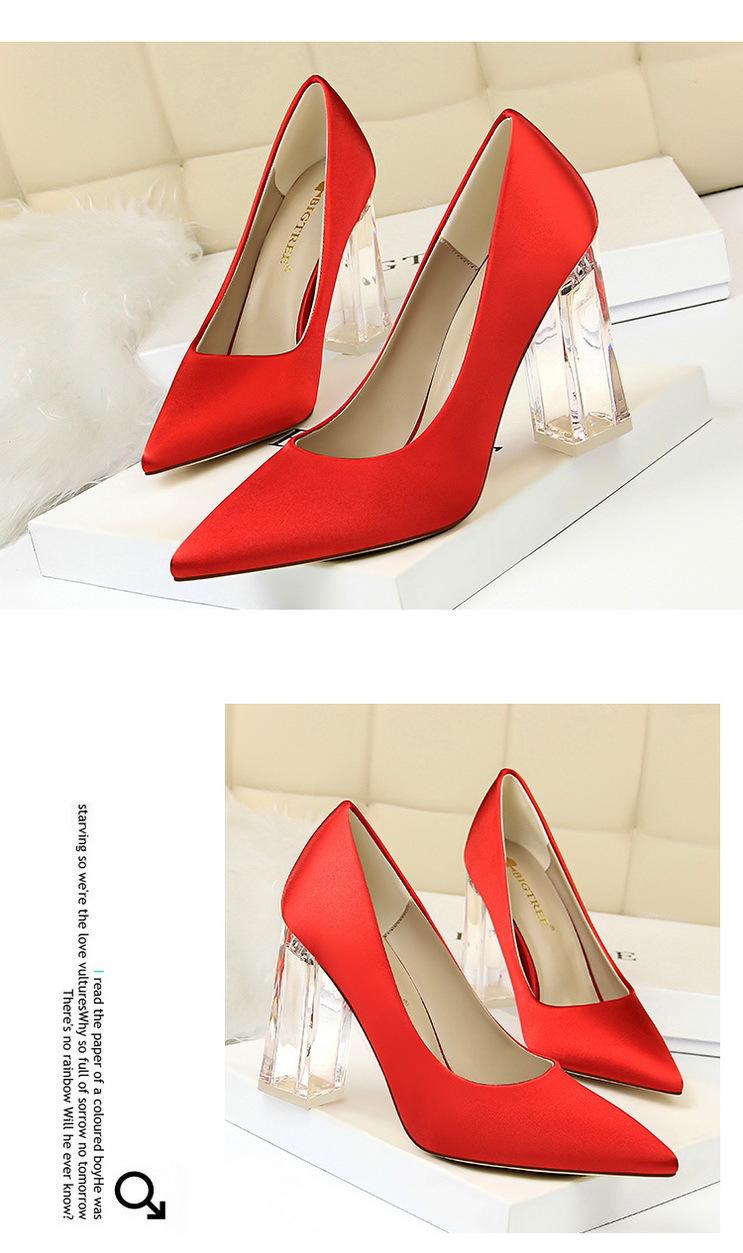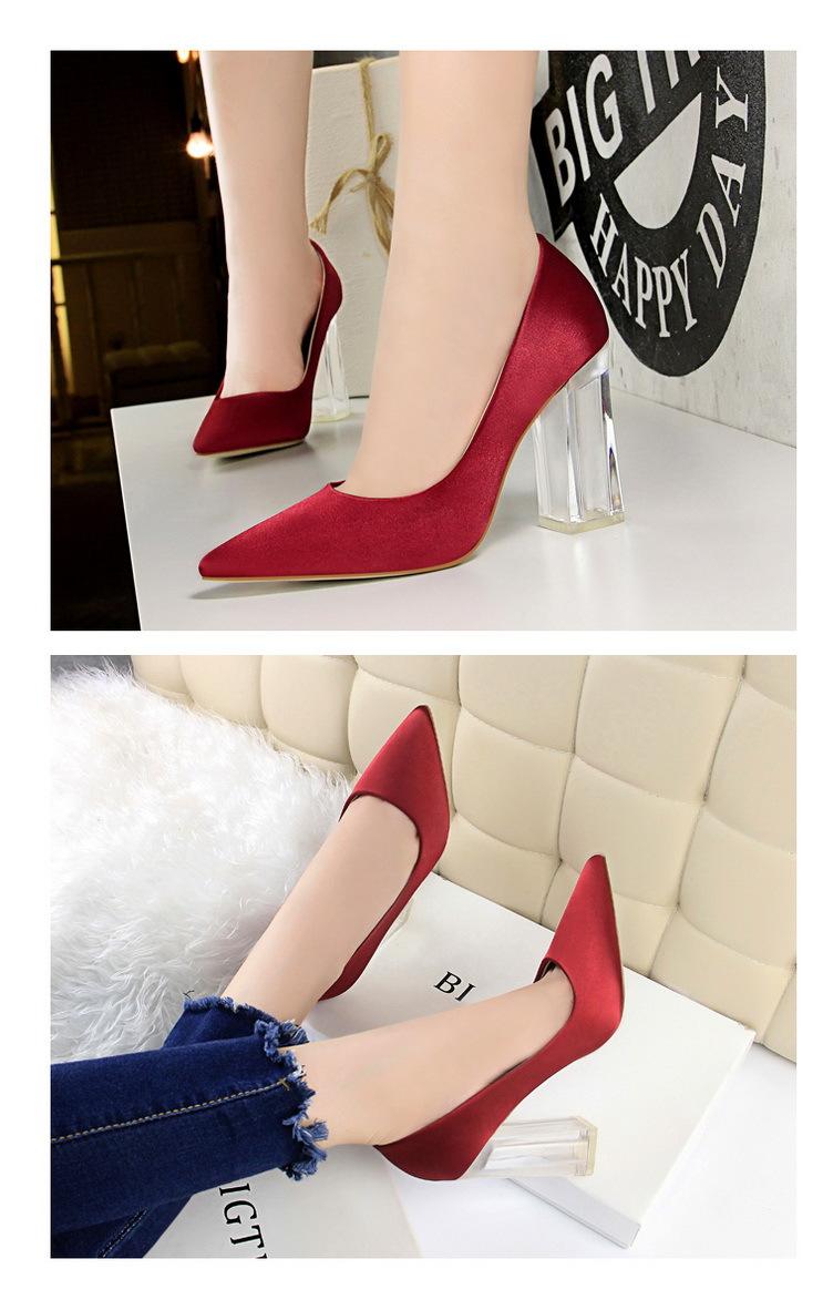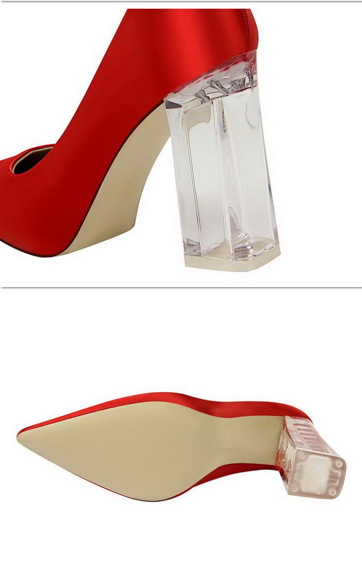 Elementos populares: Estilo coreano moderno y sexy club nocturno adelgazante simple satén tacón transparente tacón de cristal tacón grueso tacón súper alto zapatos de boda