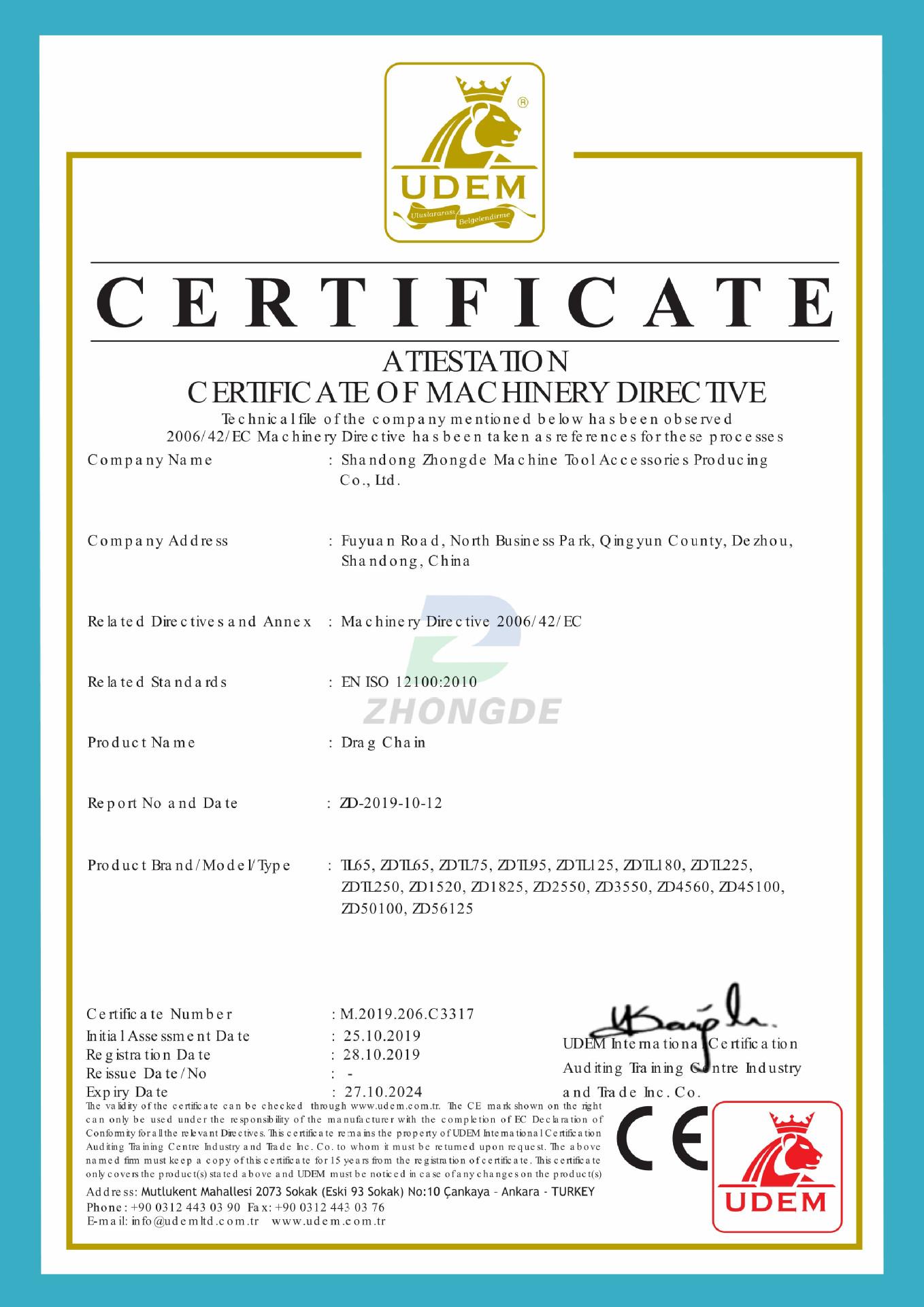 Certificado de exportación de cadena portacables de acero y aluminio, certificación CE UE de cadena portacables de acero.