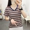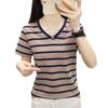 Camiseta de verano de algodón de manga corta, holgada y adelgazante, para mujer de mediana edad, con rayas que cubre el vientre y cuello en V.