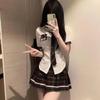 White + pink lattice [short coat + pleated skirt + bow tie + T pants + white and blue student socks]]