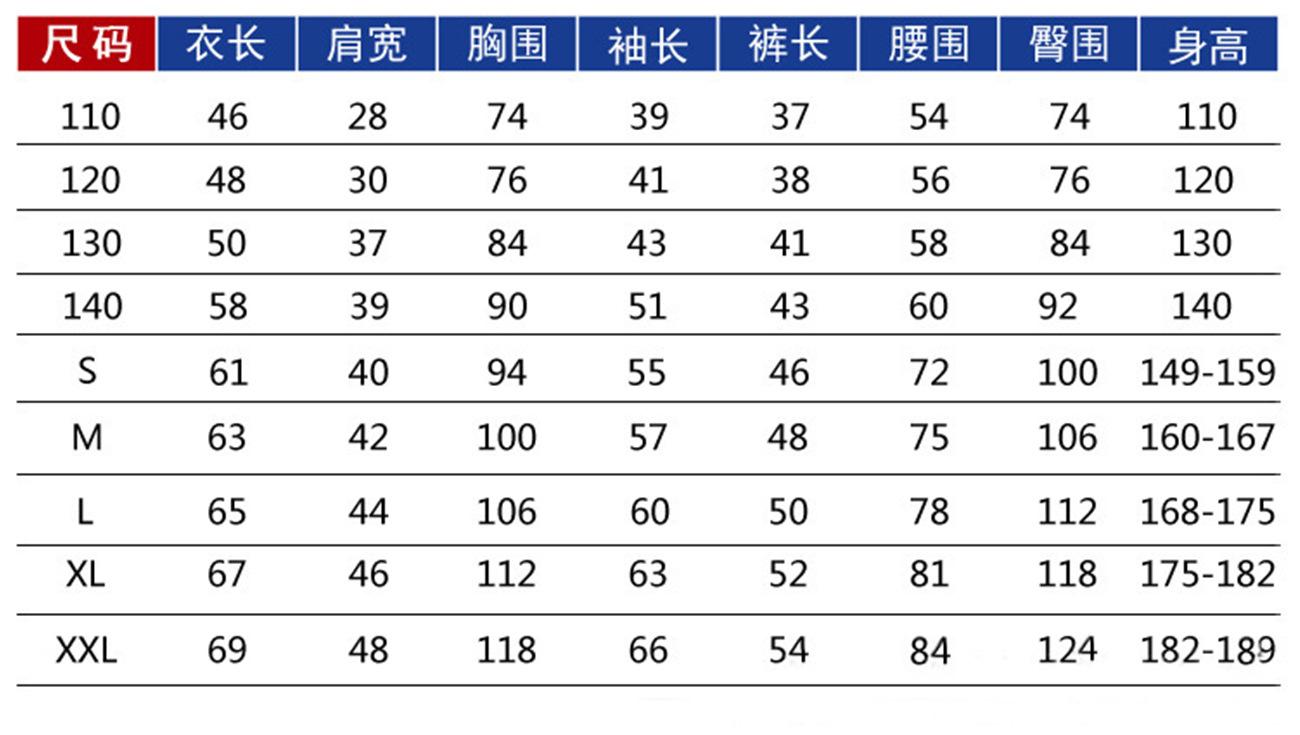 S, M, L, XL, XXL, 110, 120, 130, 140, 150