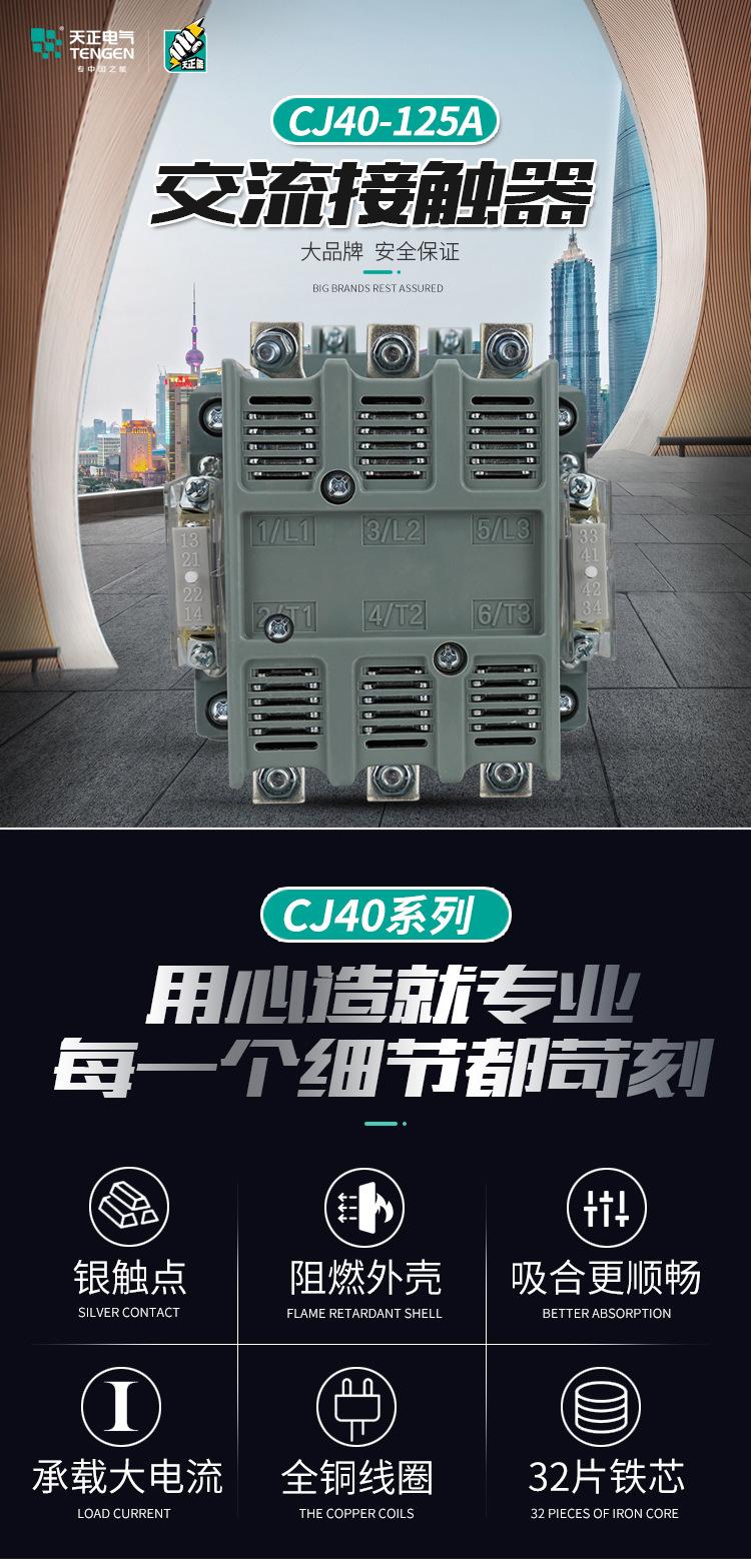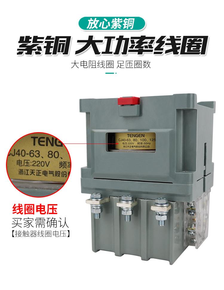 Contactor de CA TENGEN Tianzheng Electric CJ40-125A, 3 polos, trifásico, 220 V, 380 V, cable de cobre rojo, contacto plateado