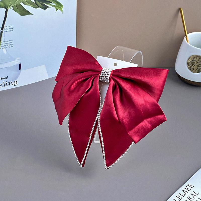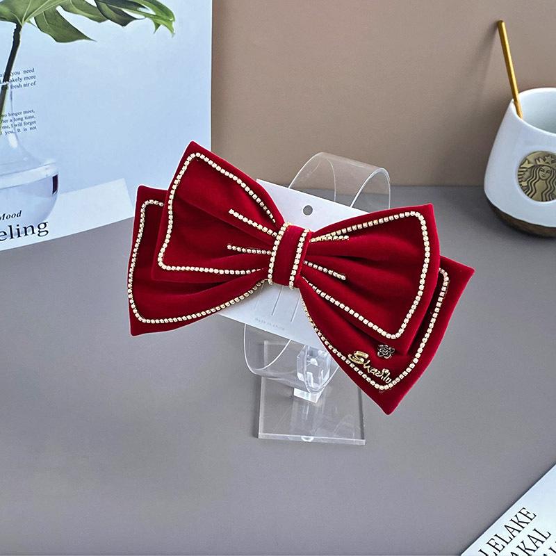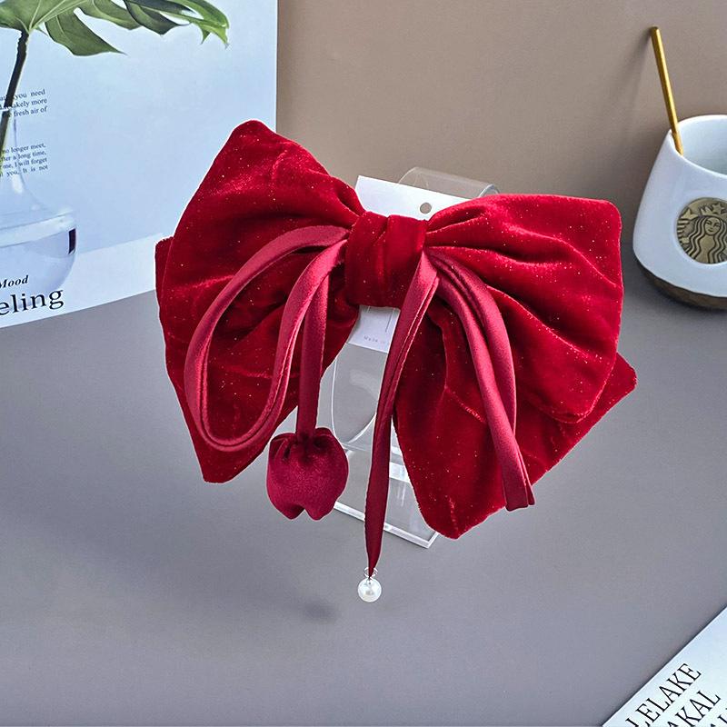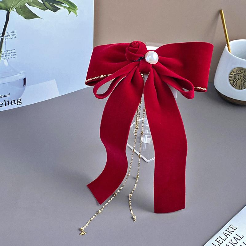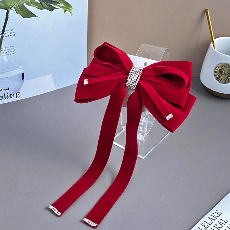 Horquilla de terciopelo rojo con lazo flotante largo para mujer, accesorio para el cabello con borlas de diamantes y pinza de resorte de alta calidad, para la parte posterior de la cabeza, de celebridad de Internet