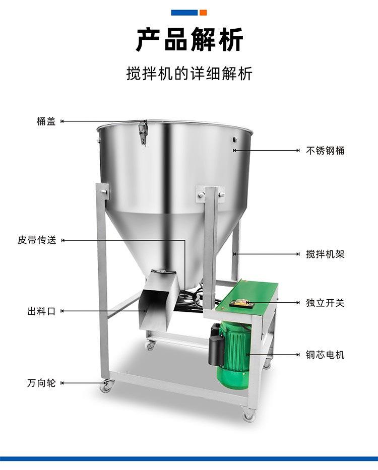 El mezclador de acero inoxidable está completamente equipado con una cubierta superior, lo que permite ahorrar en el costo del mezclador vertical de alimentos. Este pequeño equipo de procesamiento de alimentos está diseñado para agricultores rurales, pequeños corrales de engorde y pequeñas y medianas fábricas de alimentos compuestos. También puede mezclar masilla en polvo, materias primas químicas, etc., con excelentes resultados. Integra elevación vertical, tolva de mezcla y transporte horizontal de material; ofrece las ventajas de una estructura simple y compacta, una pequeña inversión única, es económico y práctico, de fácil mantenimiento y no requiere instalaciones de producción especiales. Mezcla uniformemente y puede producir premezclas, concentrados y materiales a granel. Precio en polvo, etc.