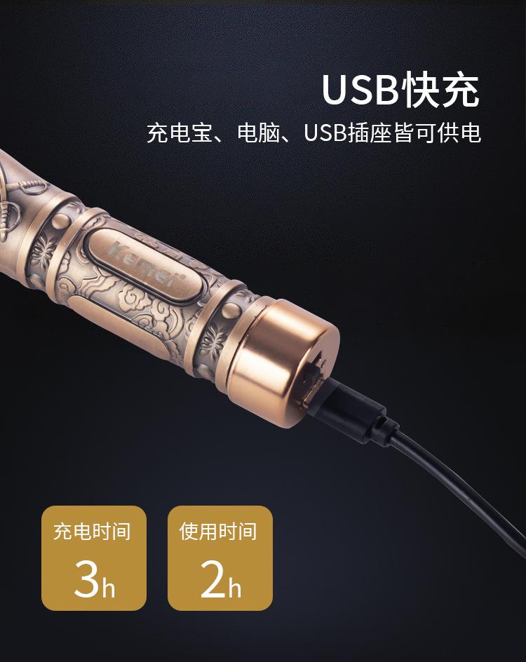 Cortadora de pelo eléctrica Kemei de metal con cabezal de aceite grabado, recargable por USB, para peluquería