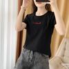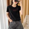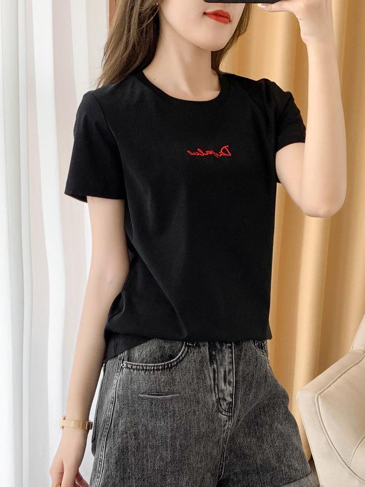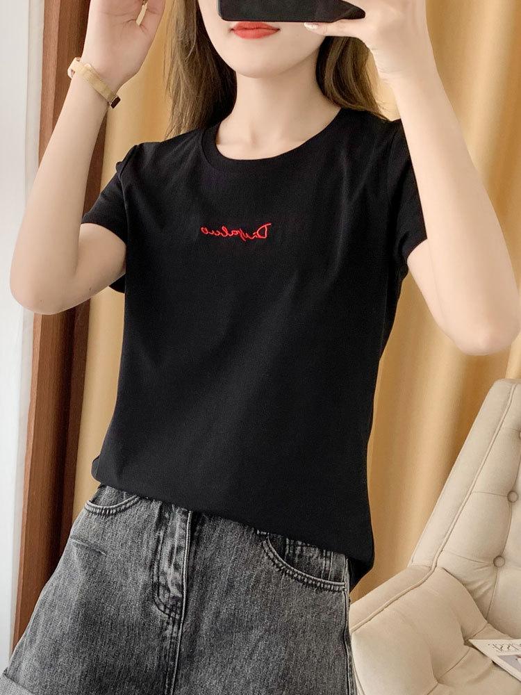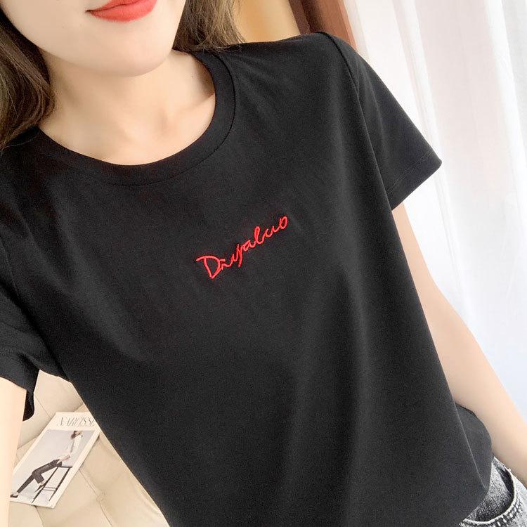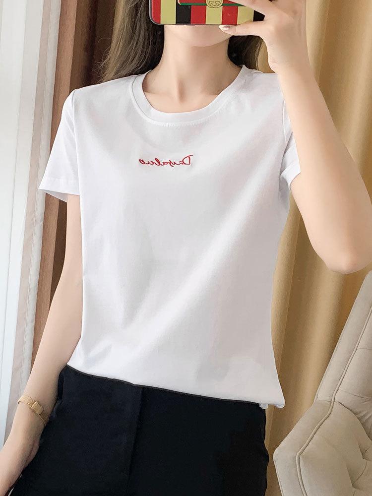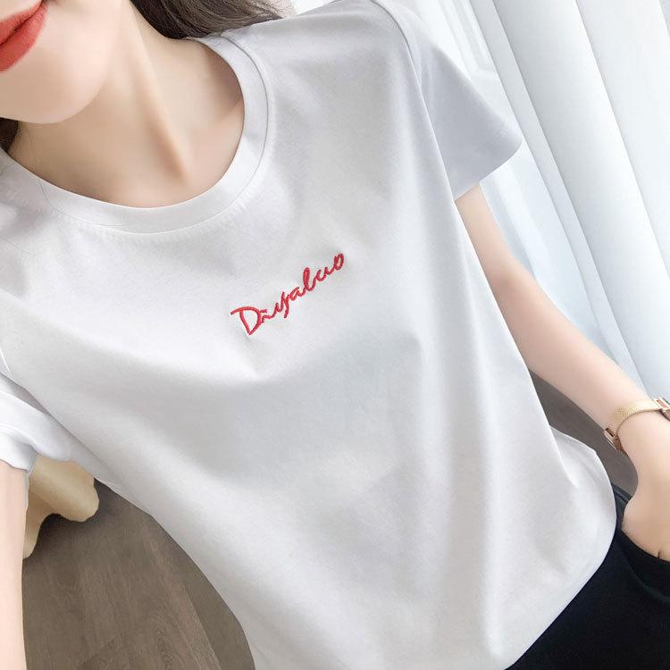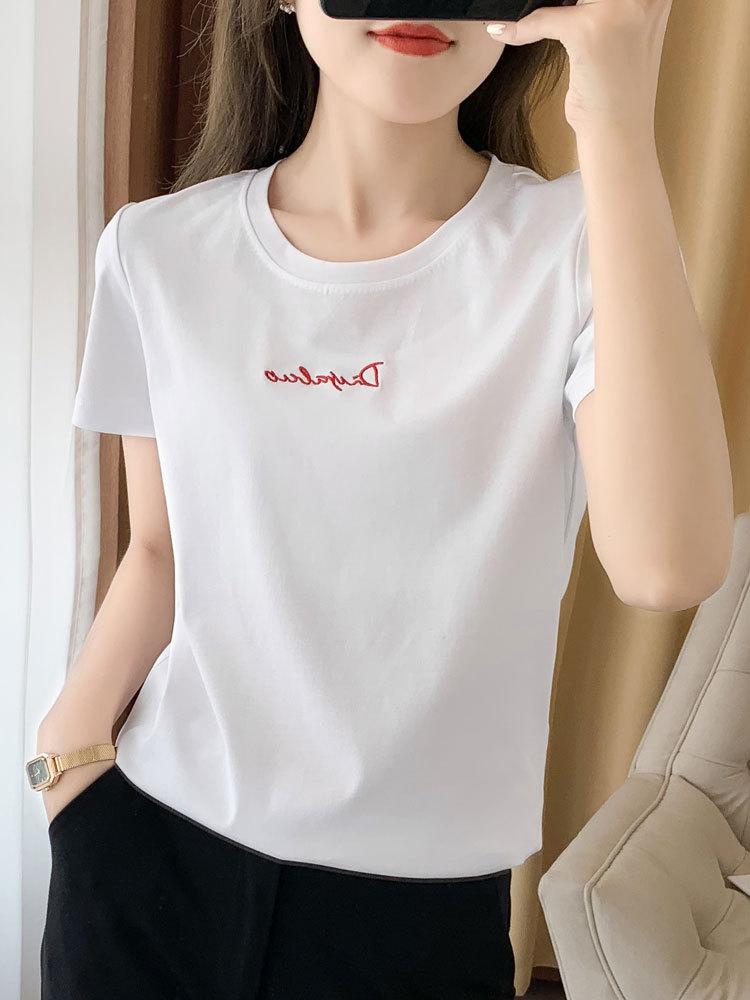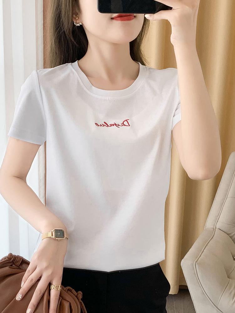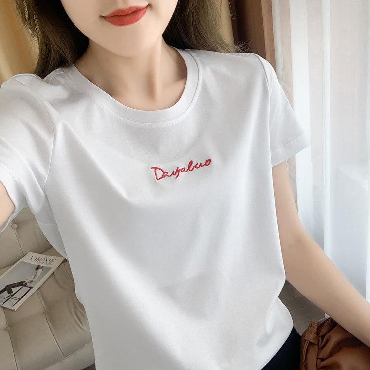 Camiseta blanca de manga corta de algodón mercerizado 80 para mujer, nueva camiseta de verano de algodón con estampado de letras bordadas, top ajustado de cuello redondo