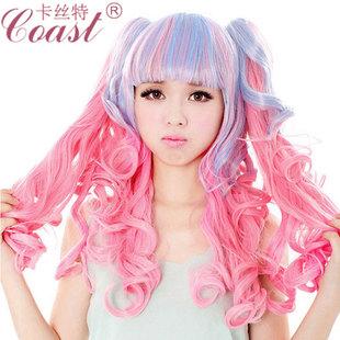 Peluca de cosplay de animación japonesa bidimensional con flequillo oblicuo, clip de boca de tigre, cola de caballo doble, peluca larga y rizada, venta al por mayor