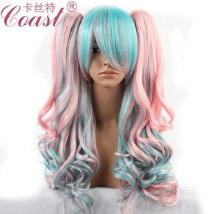 Peluca de anime, venta directa, peluca de cosplay Hatsune de seda de alta temperatura con degradado rosa y azul, peluca ondulada y rizada de lolita
