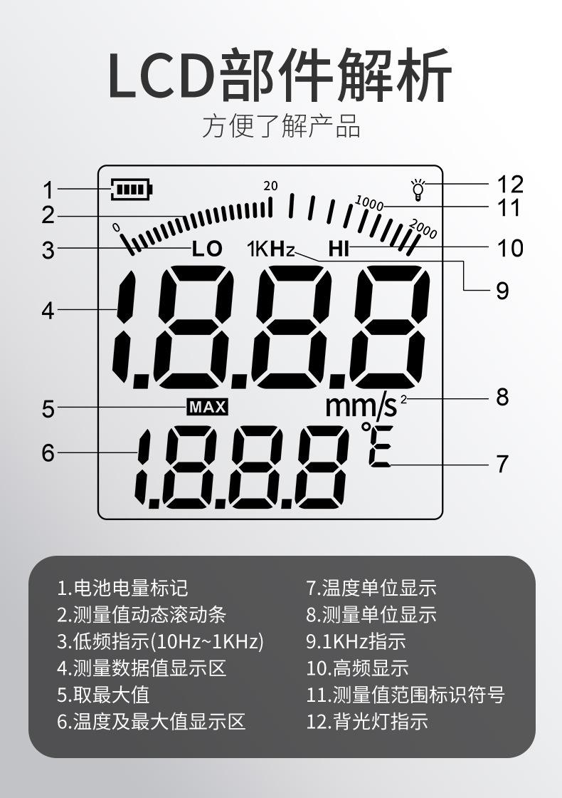 Acceleration: 0.1 ~ 199.9m/s3 peak speed: 0.1 ~ 199.9mm/s rms