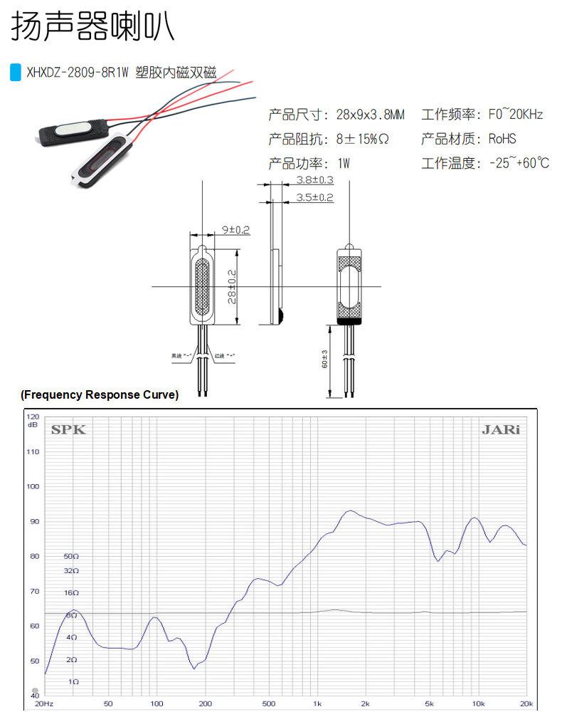 Bocina magnética doble 2809, bocina magnética interna rectangular de plástico, pequeña, de 8 ohmios y 1 W, para portátil, línea de terminales de altavoz