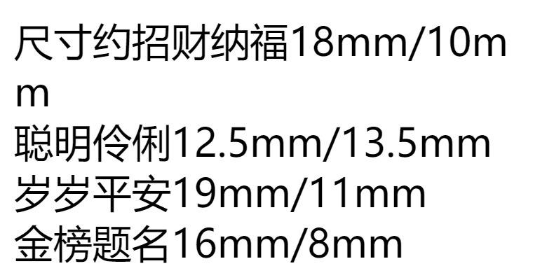 Lucky 18mm/10mm, Clever 12.5mm/13.5mm, Year-old peace 19mm/11mm, No. 16mm/8mm