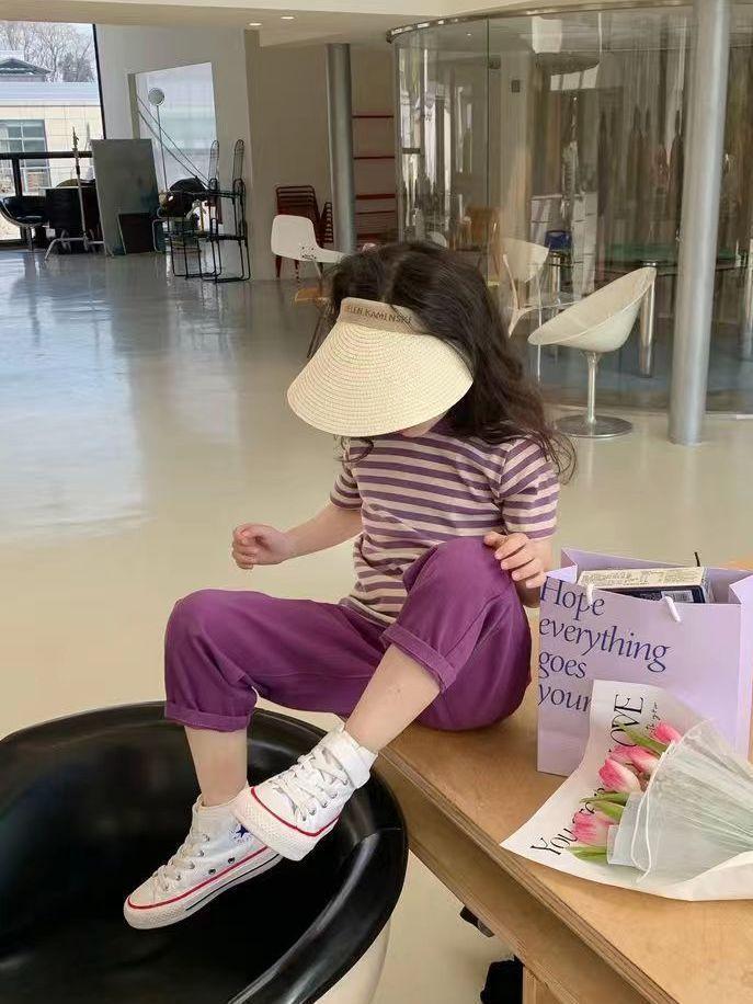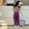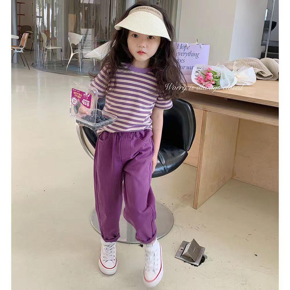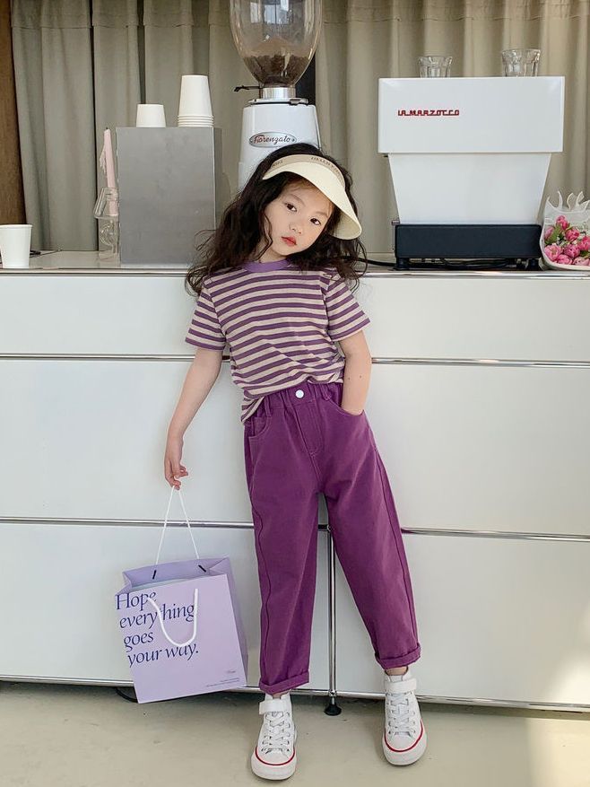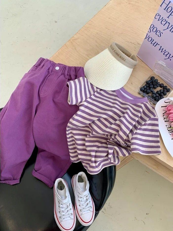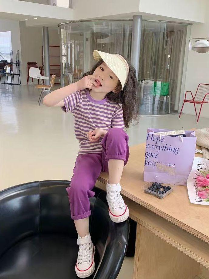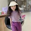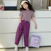 Traje de dos piezas de verano para niñas, estilo occidental, con personalidad infantil, estilo coreano moderno, camiseta a rayas, pantalones casuales.