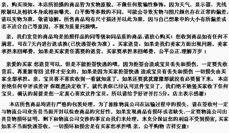 Los compradores deben leer la sección. Los cristales naturales presentan lana de algodón natural, grietas de hielo, defectos minerales y defectos artificiales causados durante el proceso de pulido. Algunas pulseras presentan pequeñas diferencias de tamaño. Esto es lo que llamamos la belleza de la imperfección. Al igual que cuando te gusta una persona, si te gusta, debes aceptar sus defectos. Nadie es perfecto, y mucho menos las gemas de hace miles de millones de años. Por favor, comprenda y valore los cristales naturales. Espero que cada cristal que le pertenezca le traiga buena suerte. Sobre la evaluación: 1. Por favor, haga una evaluación objetiva después de la compra. No deje reseñas neutrales o negativas de nuestra tienda según su estado de ánimo. Si tiene alguna insatisfacción o sugerencia durante la transacción o después de recibir los productos, debe contactarme primero por teléfono móvil o a través de Wangwang. Definitivamente lo resolveré adecuadamente. Por favor, haga una evaluación después de resolverla. Gracias por su cooperación. 2. Si no está satisfecho con los productos recibidos y no se comunica con el propietario para resolverlo, dar reseñas neutrales o negativas se considerará una evaluación maliciosa. Nuestra tienda se opondrá firmemente a las quejas hasta el final para proteger sus derechos e imagen. Gracias por su comprensión. Descripción del producto semiacabado: Los productos semiacabados son cuentas que no se han utilizado para hacer pulseras, collares, etc., sino que simplemente se unen con una cuerda. No se pueden usar directamente, y existen cuentas defectuosas individuales y una cierta tasa de desperdicio, todo ello debido al desgaste normal. Nuestra tienda se esfuerza por seleccionar productos de alta calidad para usted. Todos nuestros productos son semiacabados. Los productos semiacabados tendrán la mayoría de los defectos debido a sus bajos precios. Esto no significa que sean problemas de calidad. Debe seleccionar los productos después de recibirlos y eliminar los defectos para usar productos terminados satisfactorios. No utilice los requisitos de los productos terminados para juzgar la calidad de los productos semiacabados. ¡Los perfeccionistas no deben fotografiar! Puede fotografiar productos terminados de alta calidad y alto precio. Si no hay productos terminados, nuestra tienda también puede personalizarlos. Los productos personalizados no se devuelven ni cambian una vez emitidos, y no se admiten motivos de devolución o cambio. Lea este aviso detenidamente antes de realizar un pedido. ¡Tomar una foto significa que lo has entendido y conocido! Acerca de la explicación natural El producto pertenece a la joyería portátil. Para mejorar mejor la calidad del producto, el producto será grabado, pulido, quemado, goteado, etc. Un poco de color y otros tratamientos de optimización. Es posible que el cristal natural no pueda emitir un certificado natural después de estos tratamientos, pero no significa que no sea cristal natural. Si tiene esta demanda, considérelo detenidamente antes de realizar un pedido. Si no lo entiende, ¡consulte con el servicio al cliente! ¡No compre si le importa! Debido al gran volumen de envío diario del almacén, las imágenes de los nuevos productos no se actualizarán a tiempo sin previo aviso. Lea atentamente los detalles antes de realizar un pedido. Si no lo entiende, puede consultar con el servicio al cliente en cualquier momento. Las imágenes son solo de referencia. Los productos enviados no son los de las imágenes. Si le importa comprarlos, lea atentamente este aviso antes de realizar un pedido. ¡Si toma una foto, significa que lo ha entendido y conocido! El error de tamaño se debe a la diferencia entre cuentas de diferentes lotes o diferentes materiales. El rango de error estándar de la industria es de 0,5 mm, lo cual es un fenómeno normal. Si tiene alguna pregunta, se recomienda pedir prestado un calibrador para medirlo en una tienda física (joyería, ferretería) para ver su tamaño. Lea este aviso detenidamente antes de realizar un pedido. ¡Si toma una foto, significa que lo ha entendido y lo sabe! ! ! Notificación de agotamiento de existencias Nuestros productos son más complejos y variados. El inventario es ocasionalmente inexacto. Más del 95% están en stock. En caso de agotamiento de existencias, haremos una nota en la lista y reembolsaremos los productos al recibirlos (el pago por agotamiento de existencias es solo el pago del reembolso, excluyendo los costos de envío). No le notificaremos por separado (excepto por más notificaciones de agotamiento de existencias). ¡Por la presente declaro! Lea este aviso detenidamente antes de realizar un pedido. ¡Tomar una foto significa que lo ha entendido y lo sabe! ¡Sobre el tema de la facturación! Todos los productos en esta tienda tienen un precio sin impuestos antes de la facturación. Por favor, contacte con atención al cliente con antelación para conocer el precio con impuestos incluidos. Por favor, pague los impuestos de facturación. Lea atentamente este aviso antes de realizar un pedido. ¡Tomar una foto significa que lo ha entendido y comprendido! Sobre la entrega y la recepción Una vez fotografiado el producto, se enviará en el orden del pedido. Se enviará lo antes posible después del pago. Si la compra supera los 16.880 yuanes, se utilizará SF Express. Otros se entregarán por defecto. Por favor, asegúrese de revisar el paquete cuidadosamente al firmar para la entrega exprés. Confirme que la mercancía esté intacta antes de firmar. La firma de los miembros de la familia y los gabinetes exprés del portero es equivalente a firmar en persona. Si hay daños o mercancía de menor calidad, rechace la recepción, grabe un vídeo para guardar pruebas y contáctenos lo antes posible. Después de la firma normal, la apariencia está dañada, falta la cantidad, etc., y no se dará ninguna compensación. Lea ate