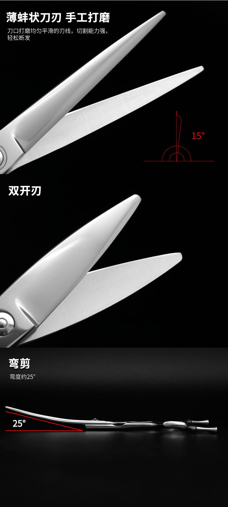 Nitidez garantizada:El ángulo de apertura de cada tijera de peluquero está determinado pormedición científica, para lograr una cierta nitidez.