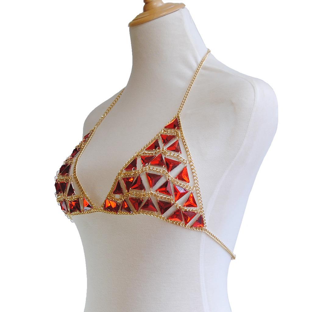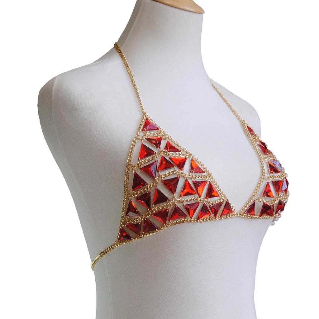 Cadena de sujetador sexy triangular de acrílico rojo hueco de verano con joyería transfronteriza europea y americana, cadena para bikini de playa