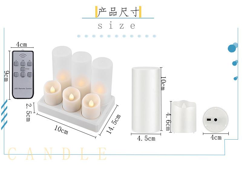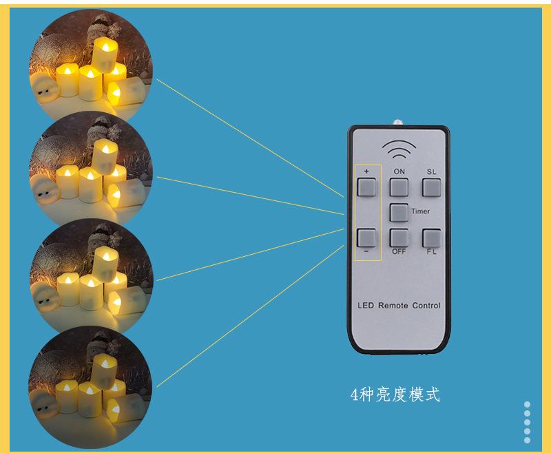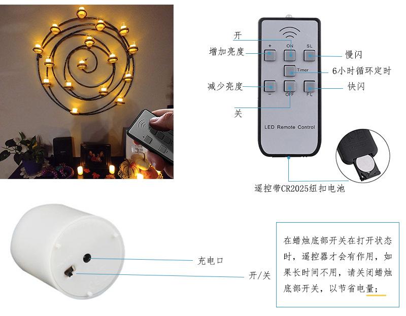 Función: Control remoto infrarrojo con temporizador de 7 botones, encendido/apagado remoto, sincronización de ciclo de 6 horas, aumento/disminución de brillo, destello rápido/destello lento, la parte inferior de la vela tiene un botón de interruptor, encienda el interruptor en la parte inferior de la vela, el control remoto funcionará