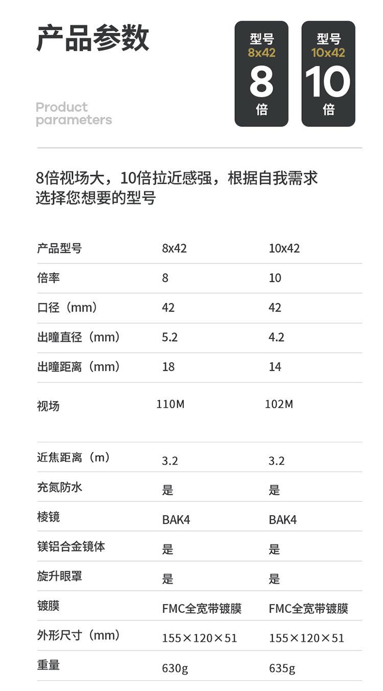 KXC10X42 binoculars standard, KXC10X42 double barrel standard + spring clip