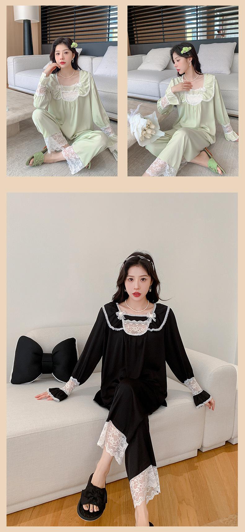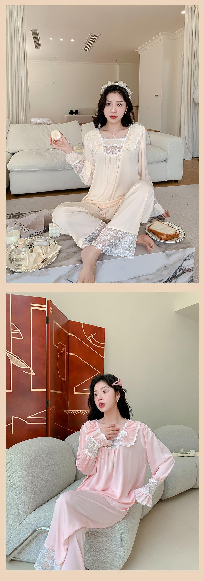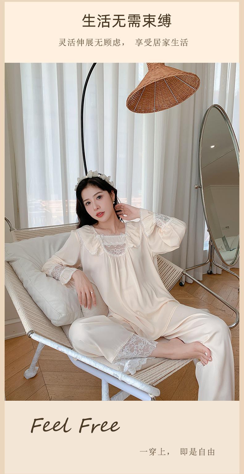 Pijama de Seda de Hielo Holgado de Manga Larga de Encaje de Estilo Francés Sexy para Primavera y Otoño para Mujer, Conjunto de Ropa para el Hogar de Estilo Perezoso