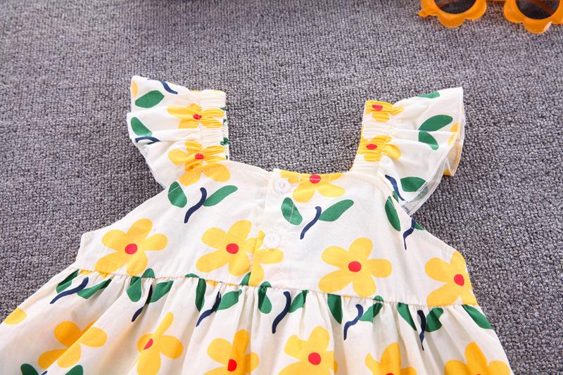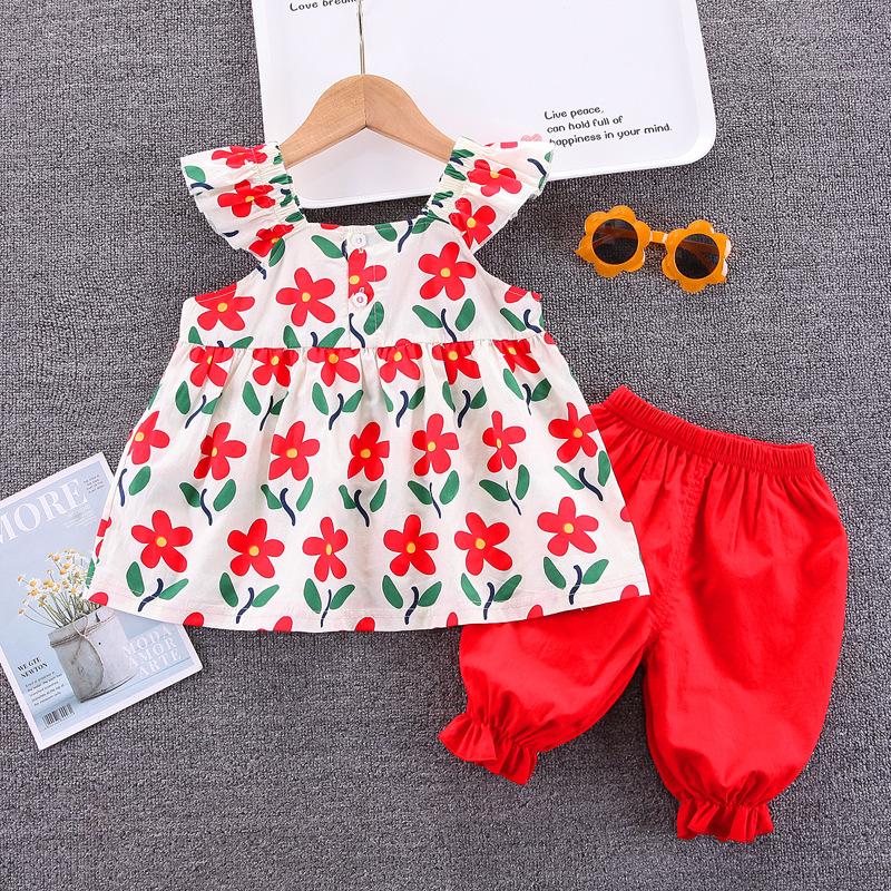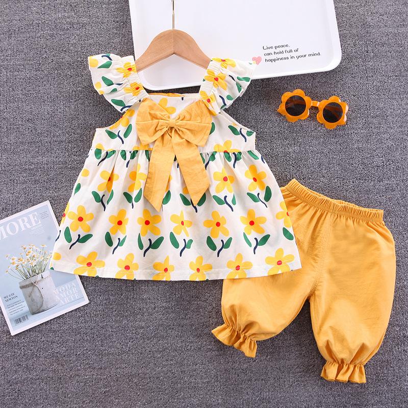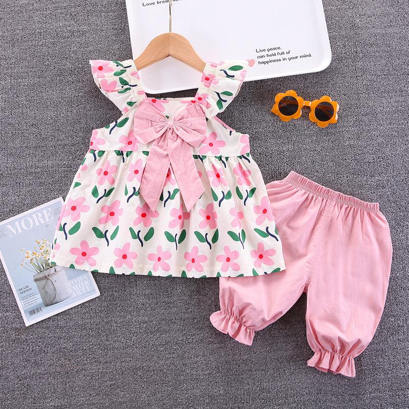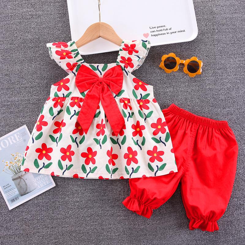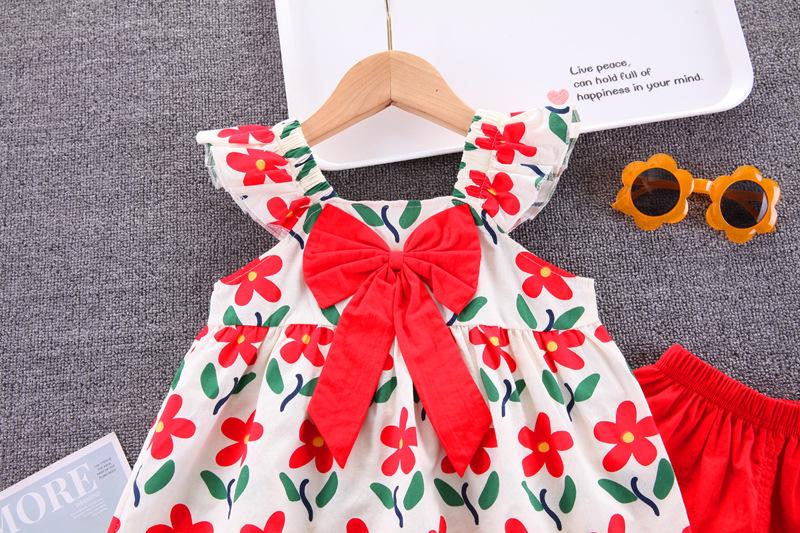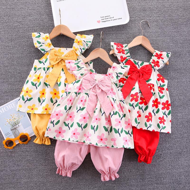 Traje de niña 2023, nuevo estilo, ropa floral de manga corta para bebé, pantalones de verano de dos piezas para niñas.