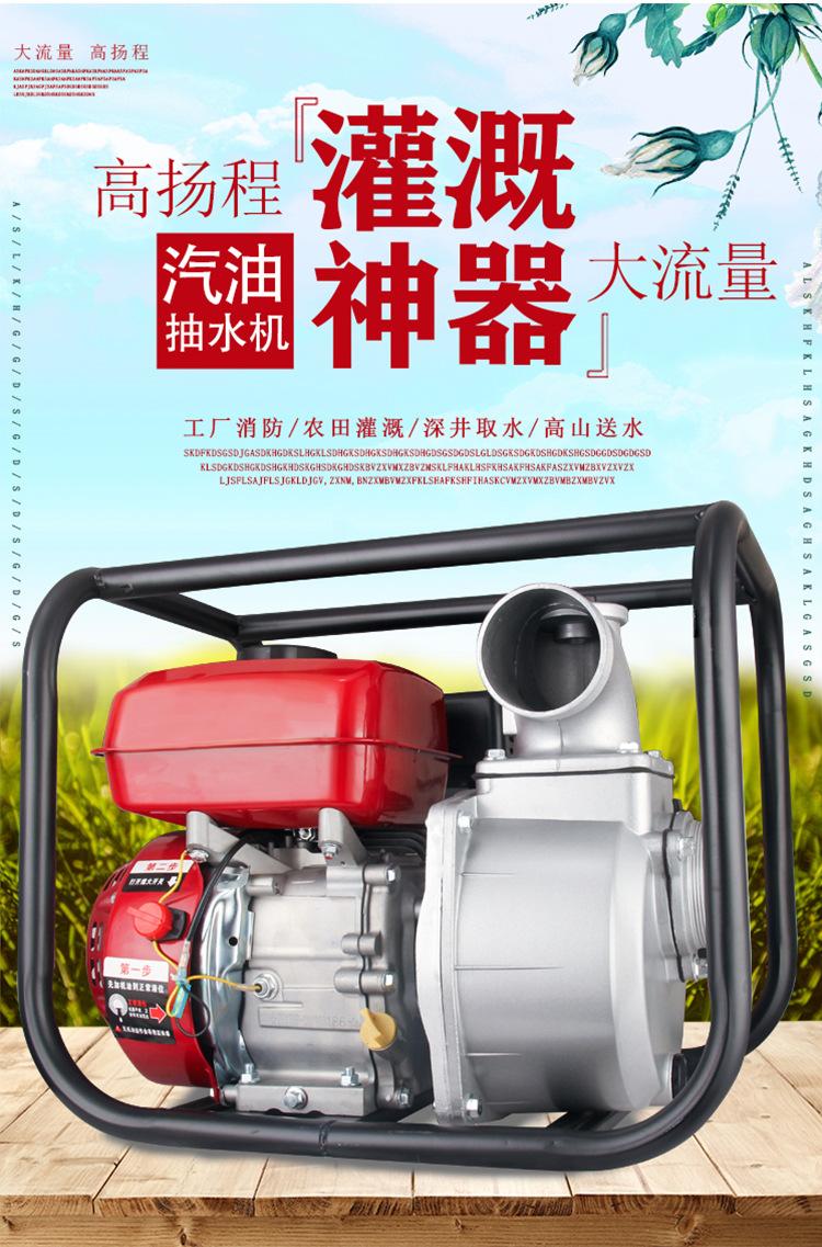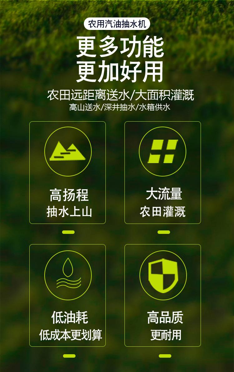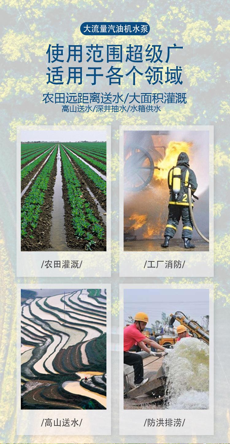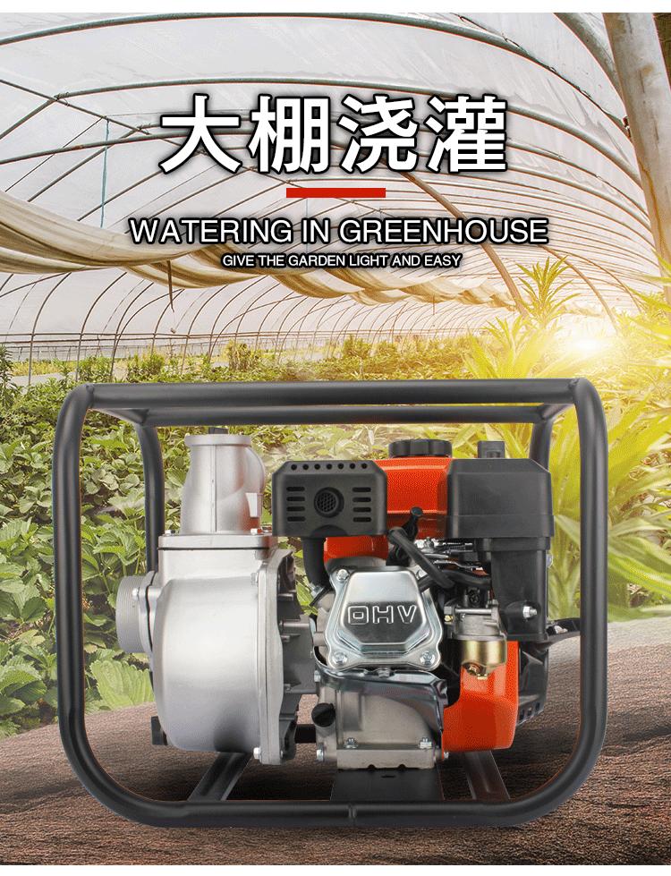 3. Se utiliza principalmente para el drenaje y riego de tierras de cultivo, así como para el suministro y drenaje de agua de granjas; también se puede utilizar para el suministro y drenaje de agua de obras de construcción, túneles, pequeños embalses y piscinas domésticas. La bomba de agua con motor de gasolina adopta el motor original Chongqing 170 (el motor con solo árbol de levas), está equipada con una alarma de aceite, un gran tanque de combustible tipo C, pintura flash y soportes dobles. Por favor, añada aceite de motor de gasolina de cuatro tiempos: 0,6 litros antes de usar. No llene el buzón con gasolina demasiado. Está prohibido arrancar sin agua en la bomba. Es mejor drenar el agua en el cuerpo de la bomba cuando no esté en uso para evitar la corrosión del cuerpo de la bomba. Lea atentamente las instrucciones. El motor con árbol de levas de acero es potente y muy eficiente en combustible, lo que lo convierte en su opción ideal. La bomba de agua con motor de gasolina es una bomba centrífuga.