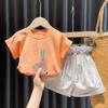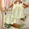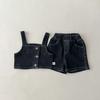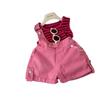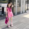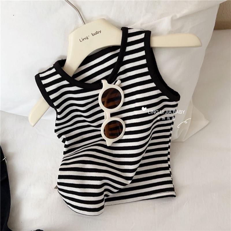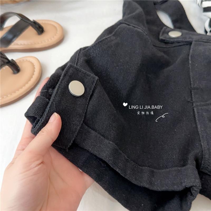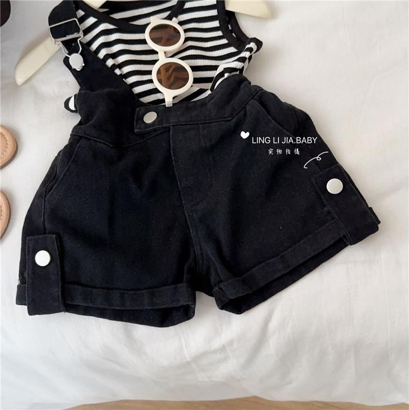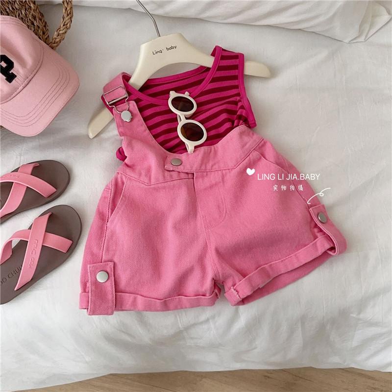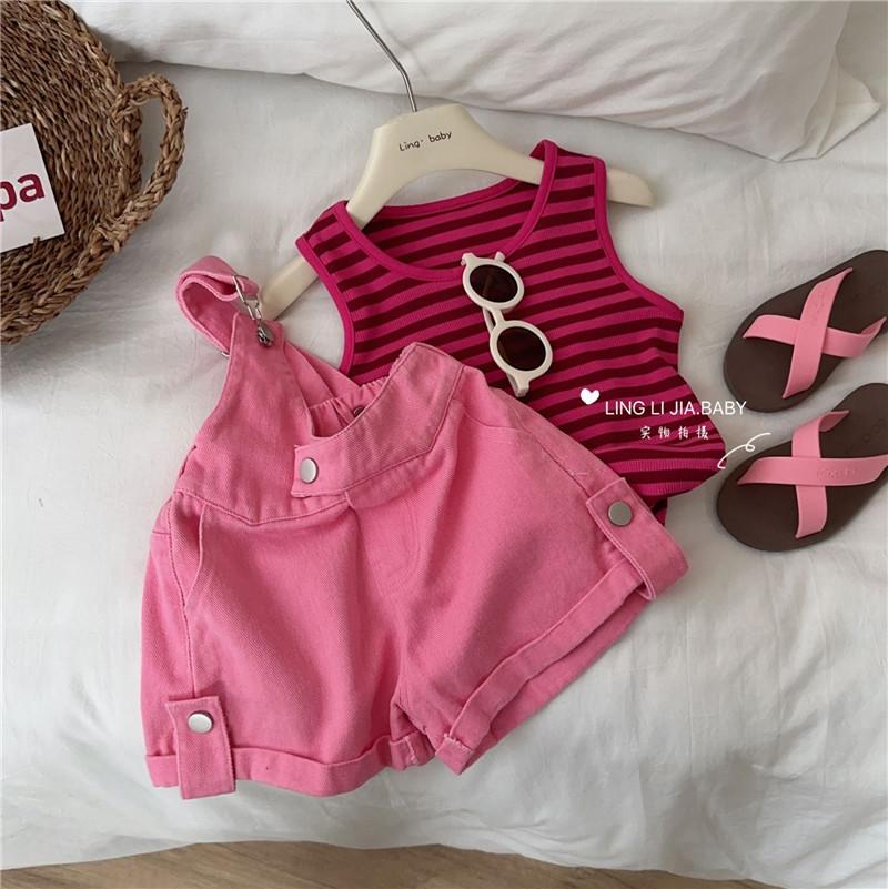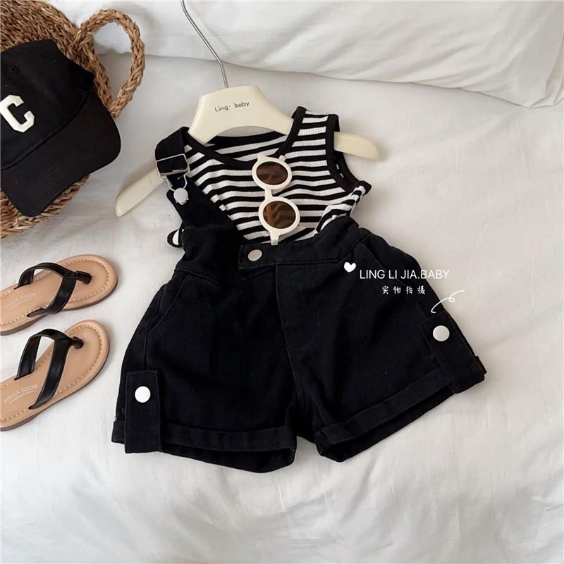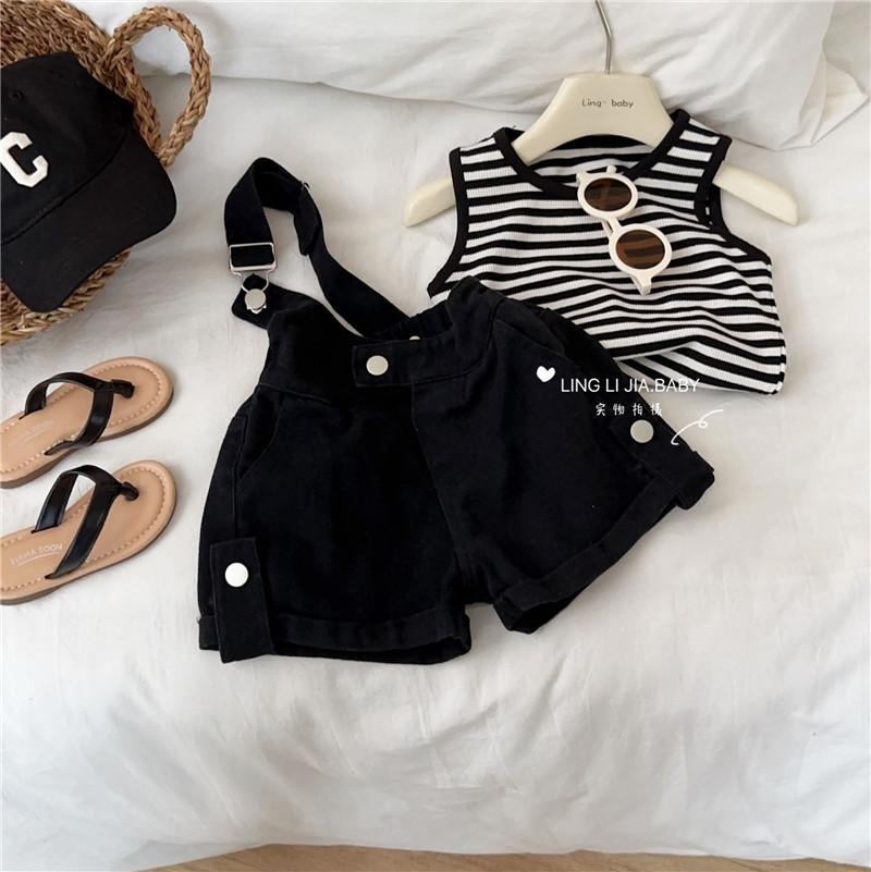 Traje de verano para niñas, elegante y distintivo, de moda coreana, con chaleco a rayas y pantalones cortos con tirantes irregulares.