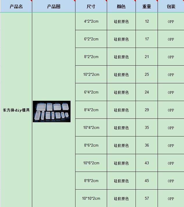 4*2*2cm, 6*2*2cm, 8*2*2cm, 10*2*2cm, 6*4*2cm, 8*4*2cm, 10*4*2cm, 8*6*2cm, 10*6*2cm, 8*8*2cm, 10*10*2cm