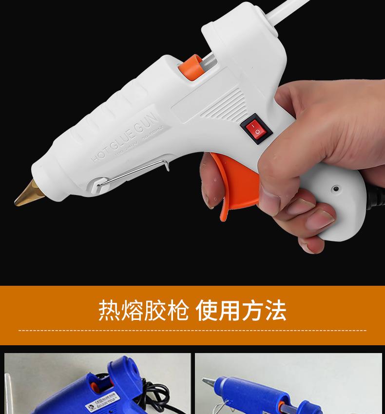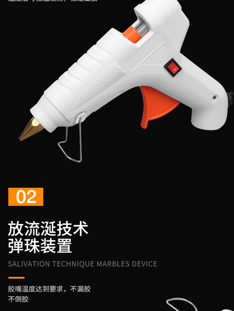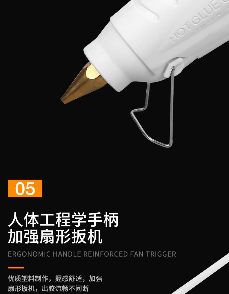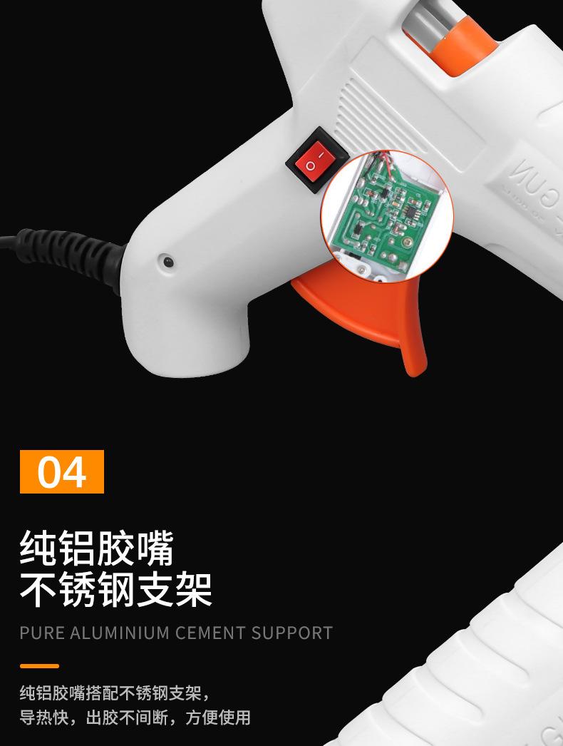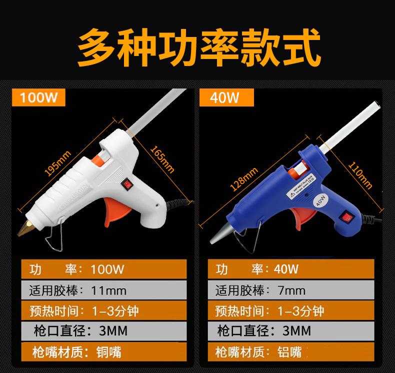 Los cabezales de las pistolas de pegamento entre 40W y 80W están todos hechos de aluminio. Las pistolas de pegamento pequeñas de 40W y 50W usan barras de pegamento pequeñas de 7MM, y las pistolas de pegamento grandes de 80W usan barras de pegamento grandes de 11MM.