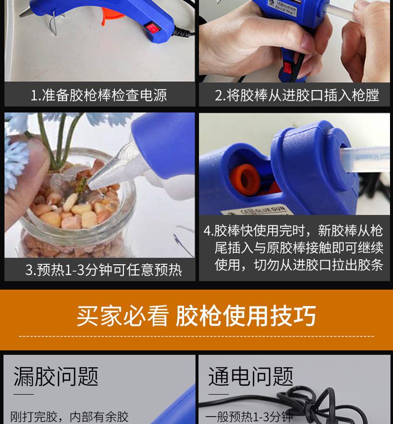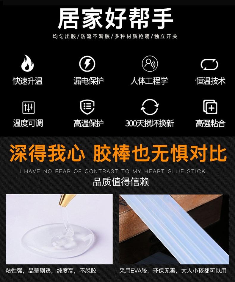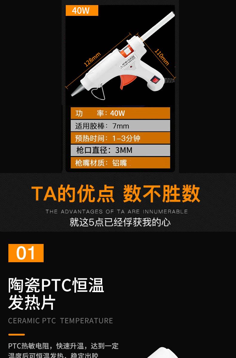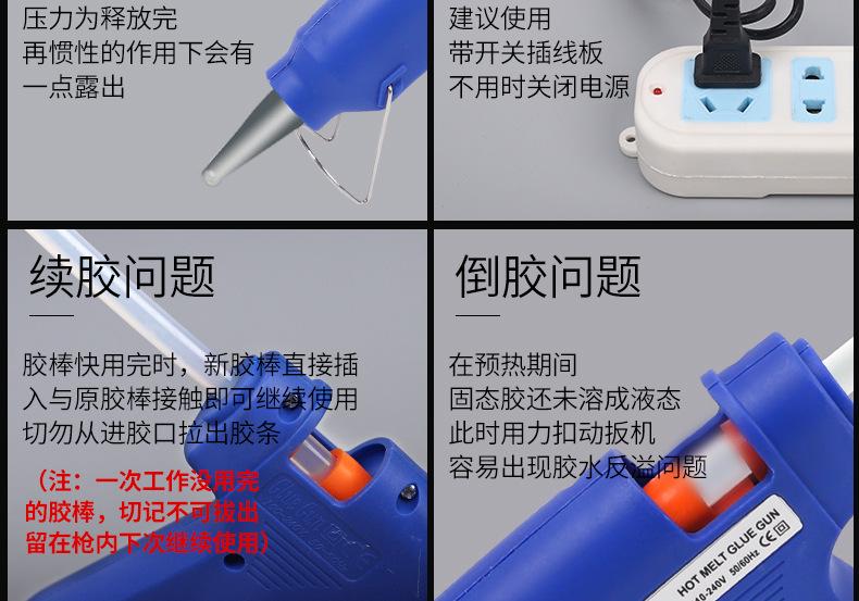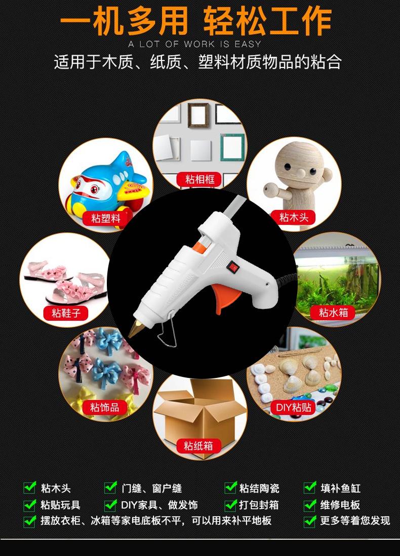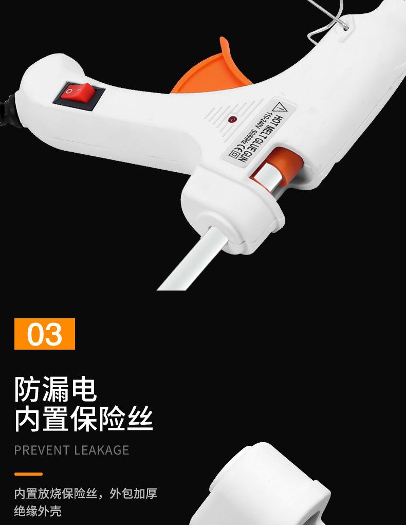 Los cabezales de las pistolas de pegamento entre 40W y 80W están todos hechos de aluminio. Las pistolas de pegamento pequeñas de 40W y 50W usan barras de pegamento pequeñas de 7MM, y las pistolas de pegamento grandes de 80W usan barras de pegamento grandes de 11MM.