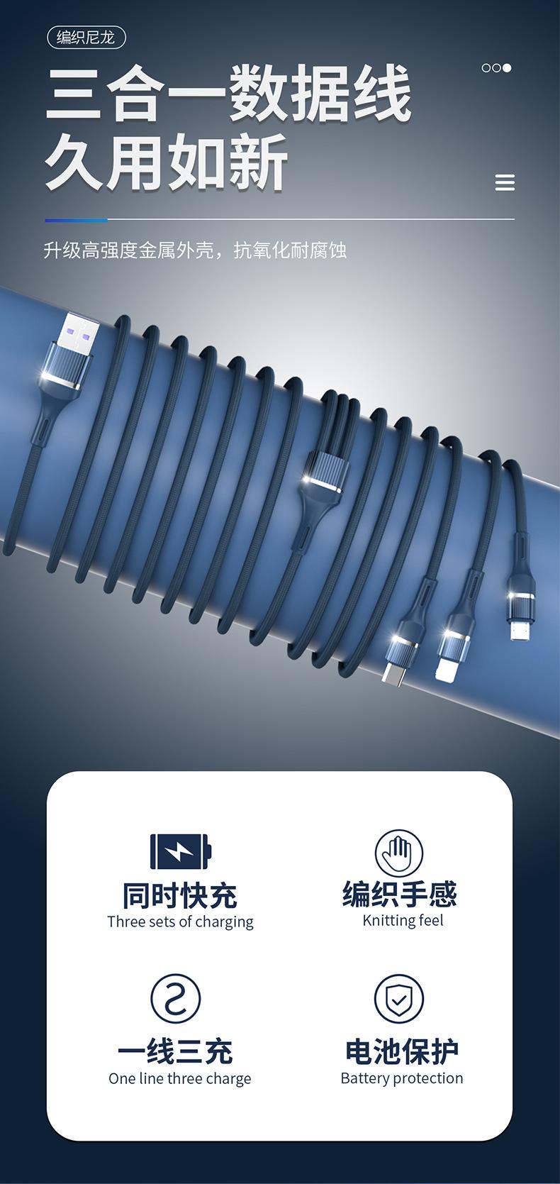 | Nuevo cable de datos de carga súper rápida de 6 A, uno a tres, cable de carga tres en uno de Apple TIPO C trenzado de tela de 100 W |