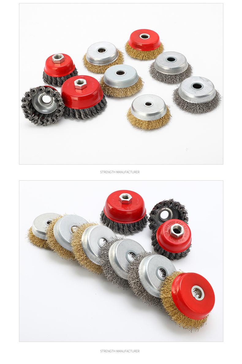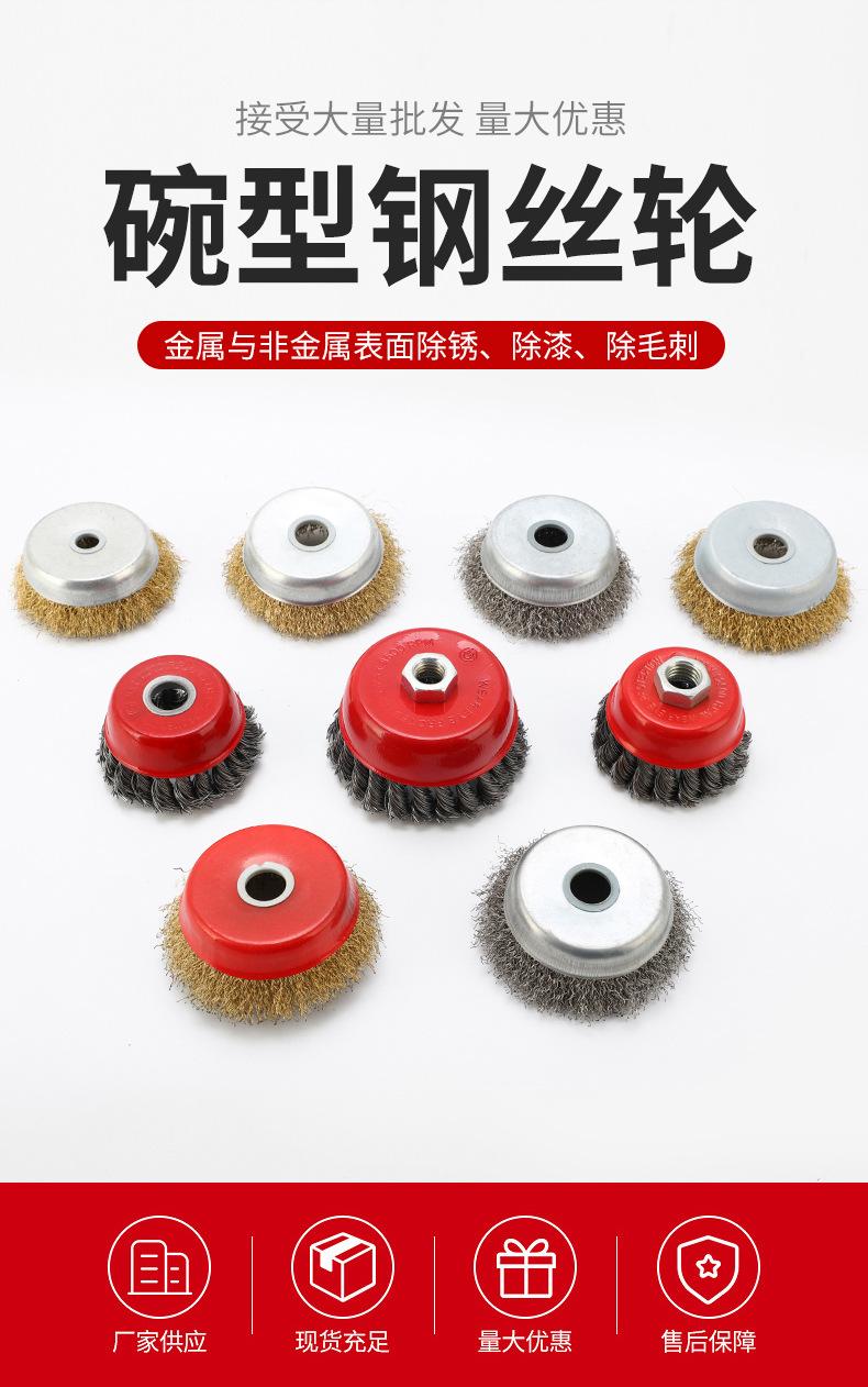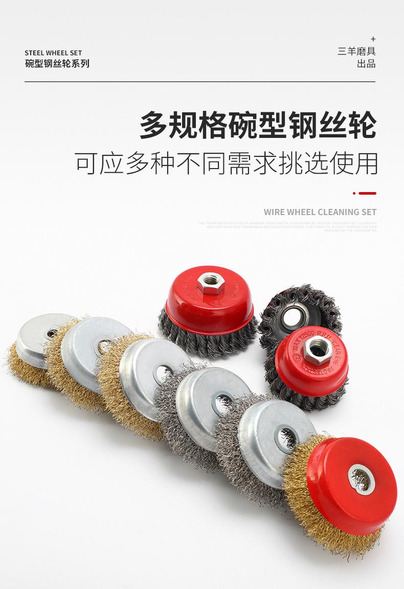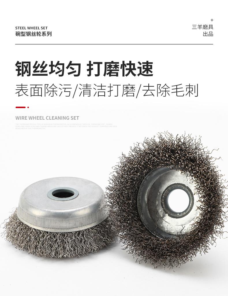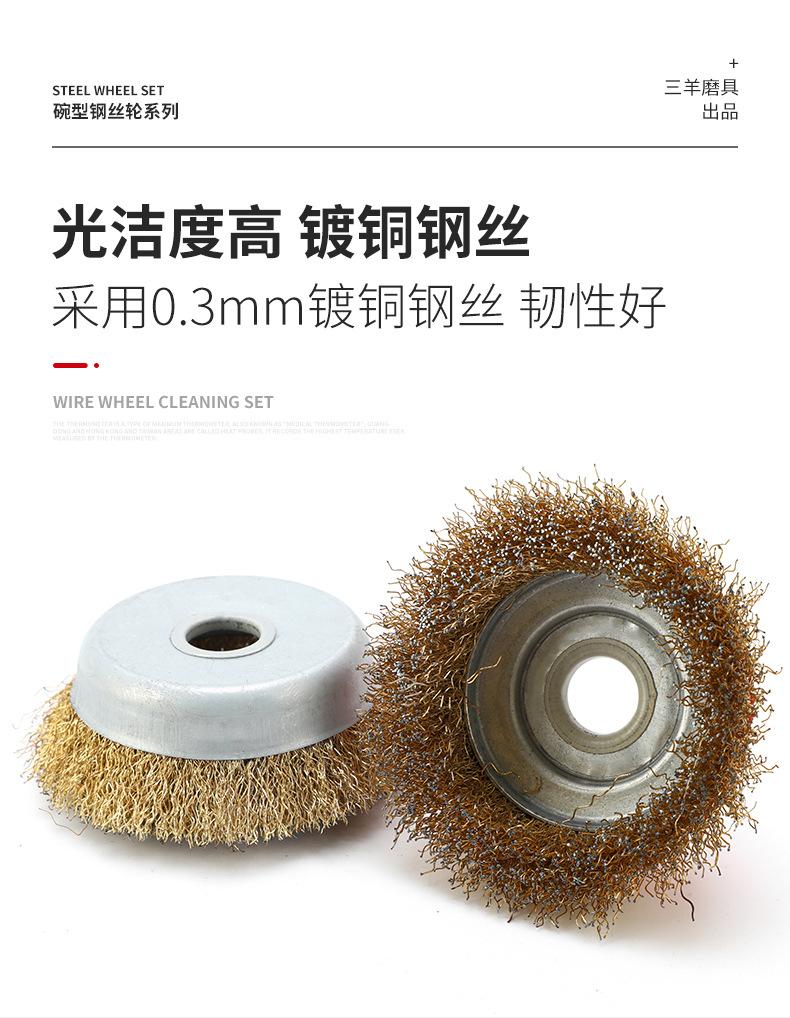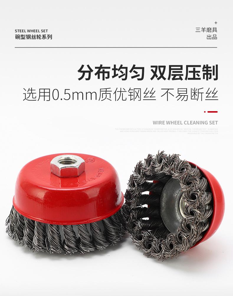Venta al por mayor de herramientas de pulido Sanyang, rueda de alambre tipo cuenco, cepillo de alambre para eliminar óxido, rueda de alambre de acero inoxidable, alambre trenzado, cepillo de cuenco de alambre para pulir
