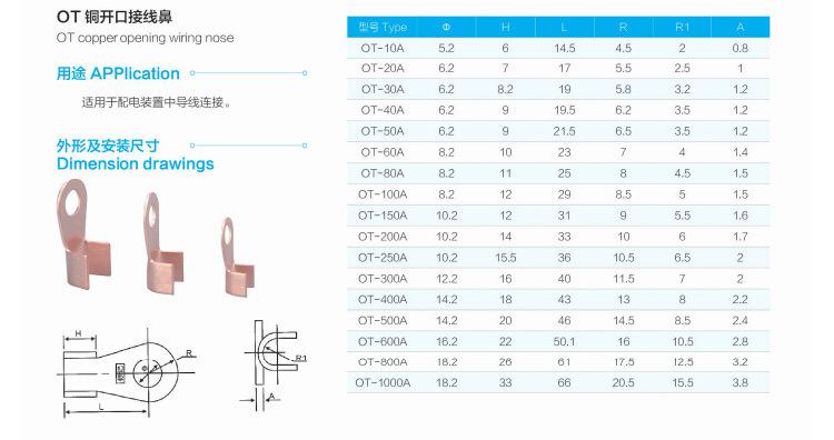 Terminal de cobre de nariz abierta para cable de nariz OT-150A, terminal de cobre para cableado