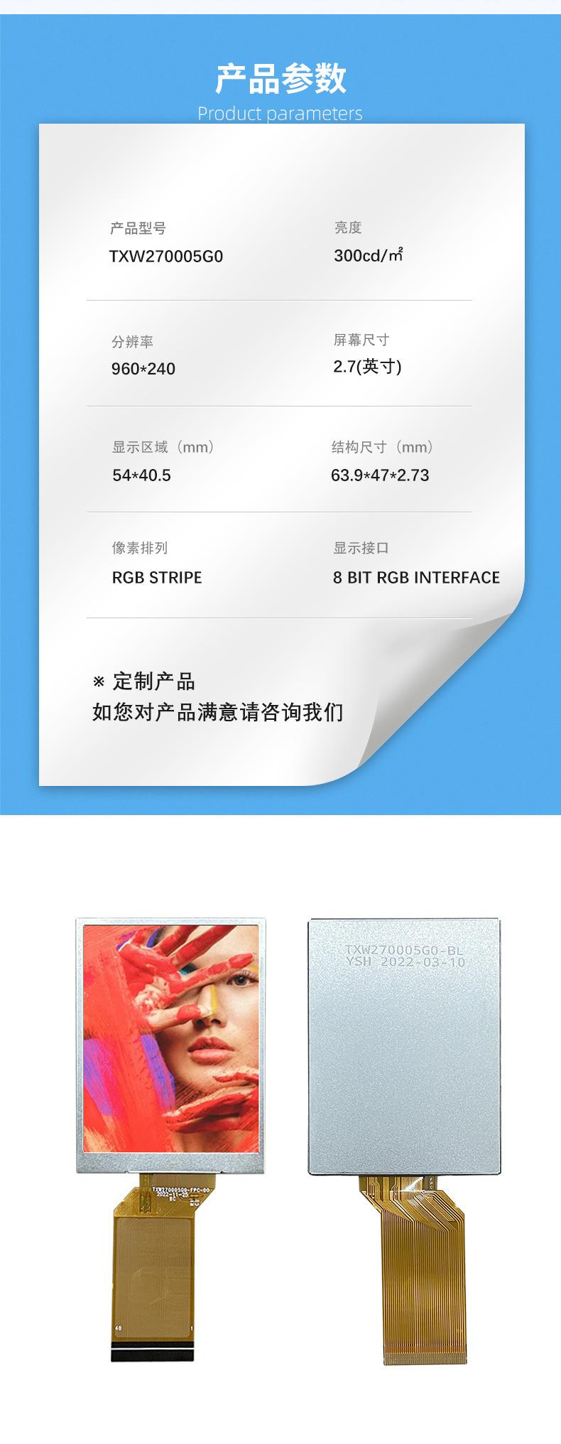 Pantalla LCD horizontal digital de 2,7 pulgadas, 960 x 240, para control industrial, equipo médico portátil, montada en vehículo