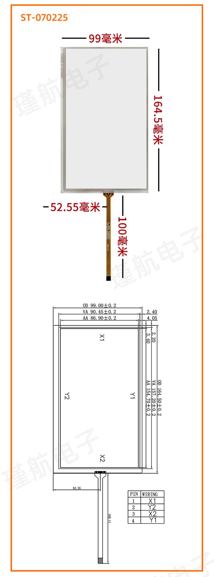 Pantalla táctil de resistencia de cuatro hilos de 7 pulgadas, 164,5 x 99, salida central, interfaz FPC, grado médico militar
