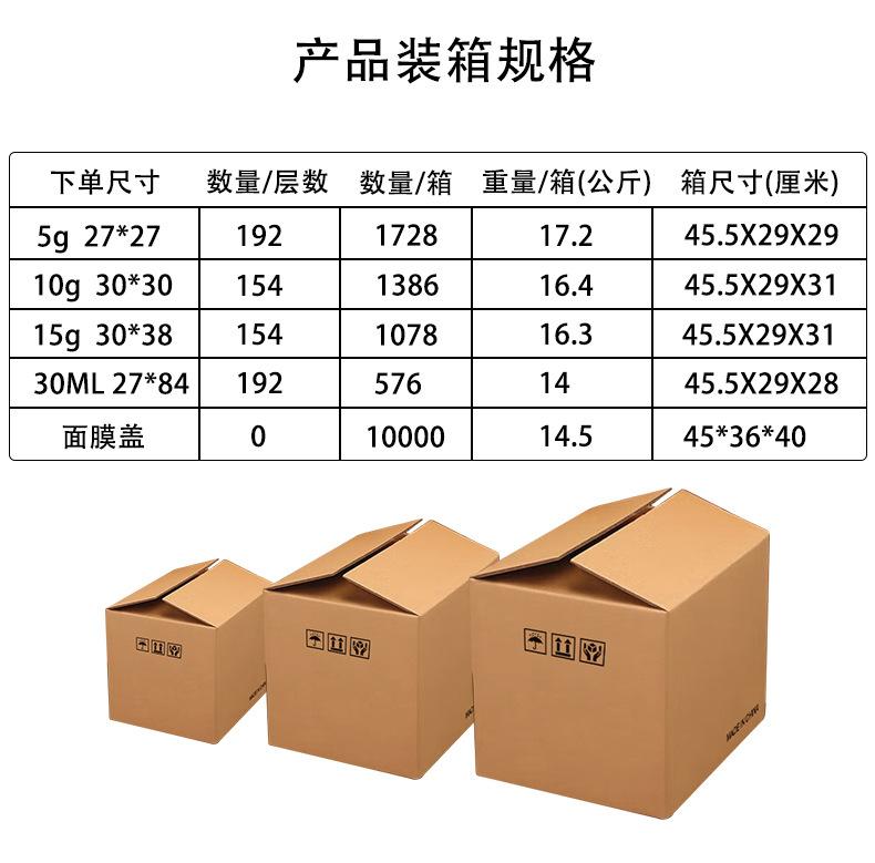 5g, 15g, 10g, 30ml (facial mask tube), Brown bottle (need to be customized), Spoon (minimum bid of 50)
