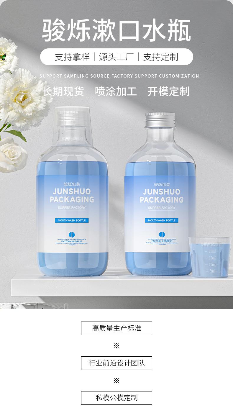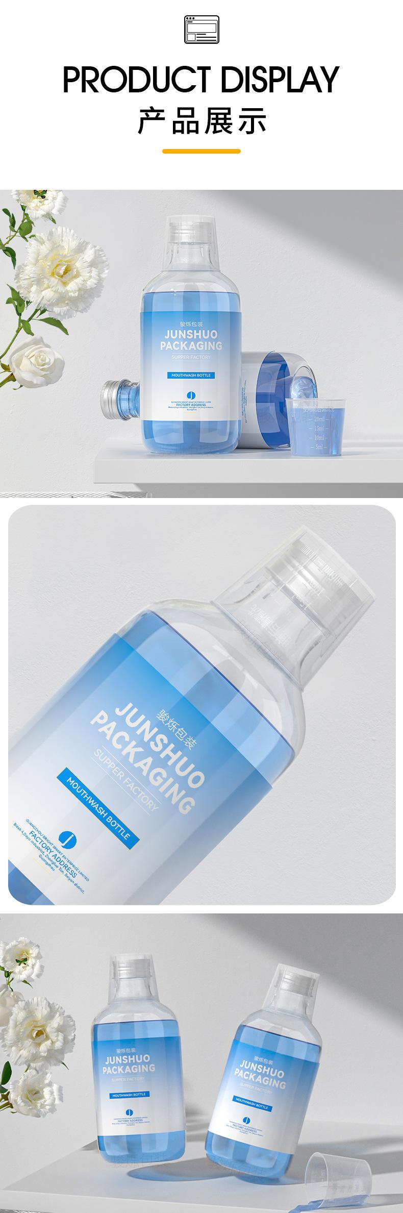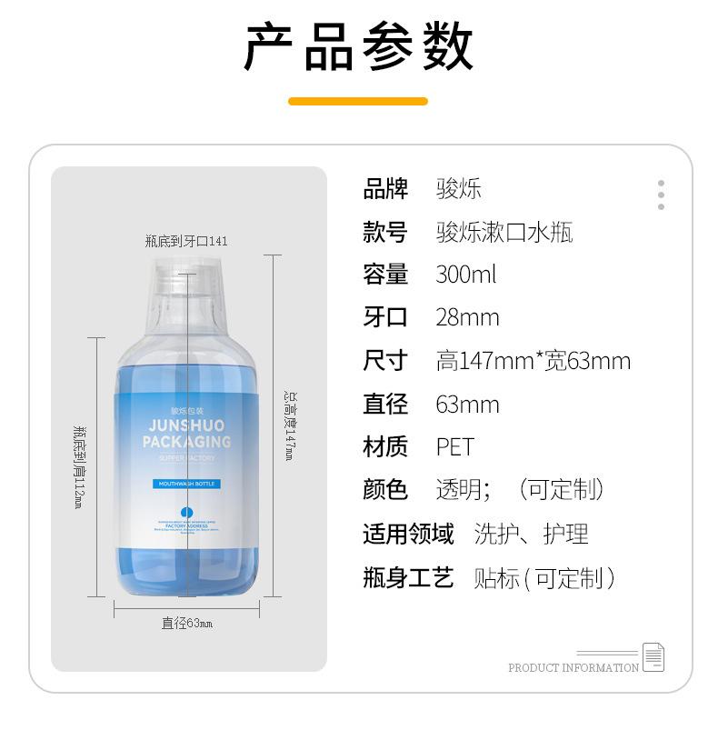 Botella de 300 ml para enjuague bucal, con tapa de aluminio transparente y vaso medidor, para 28 dientes, venta al por mayor.