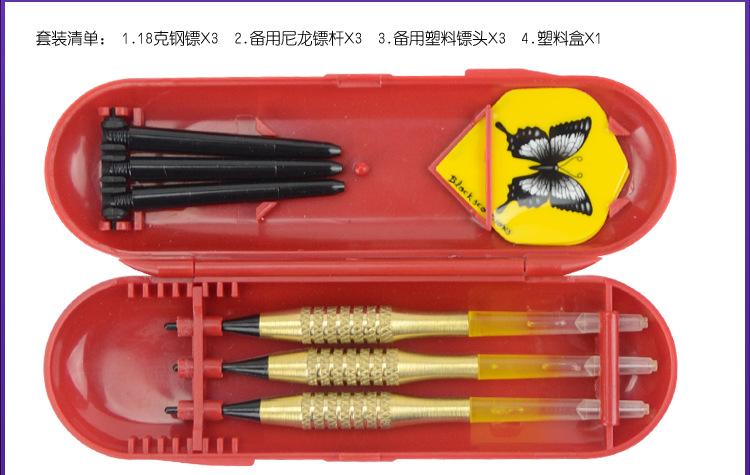 [Incluye]: tres dardos completos, tres ejes de dardo de plástico, tres puntas de dardo de plástico y una caja de almacenamiento de plástico