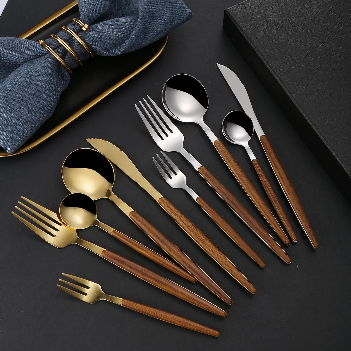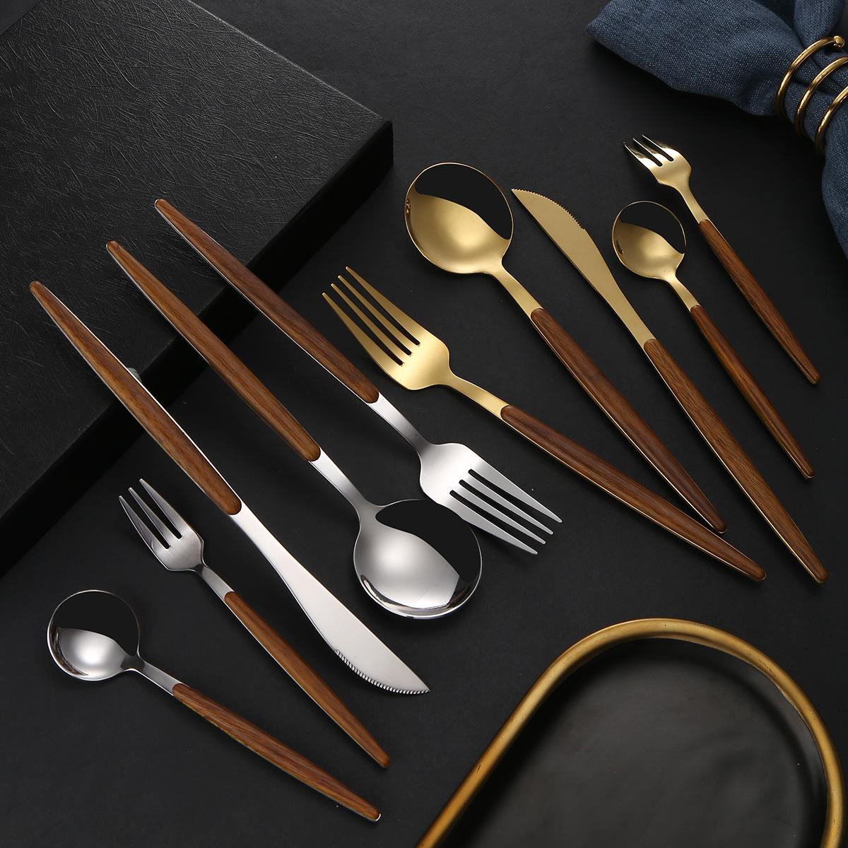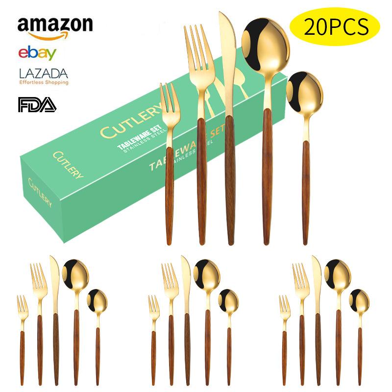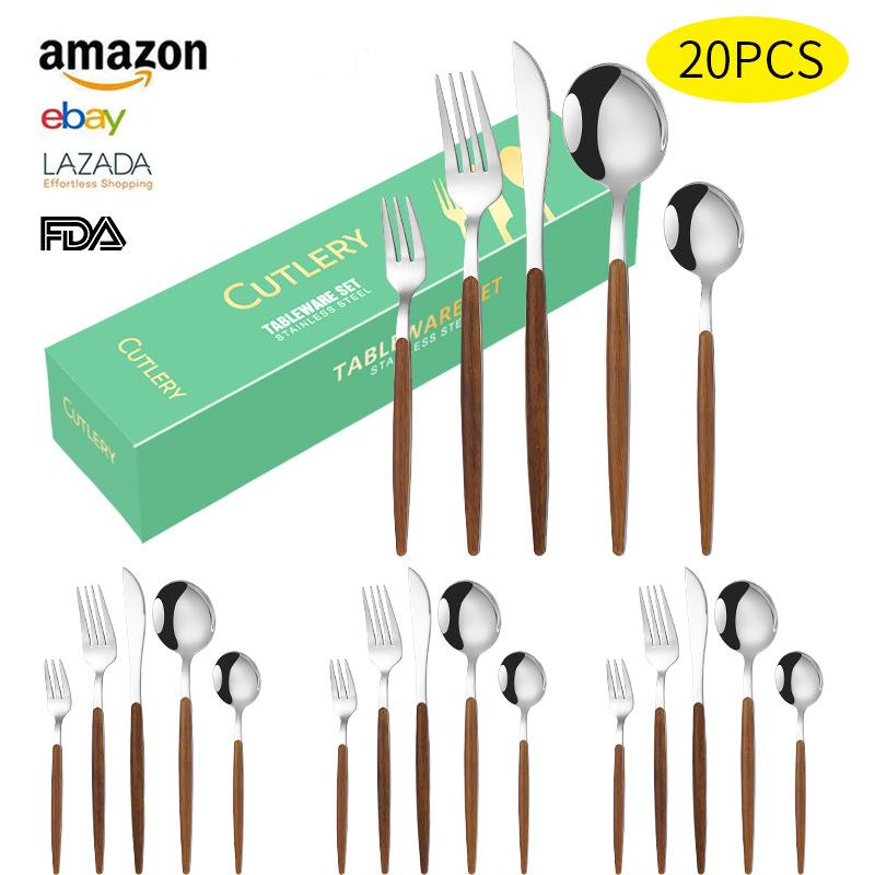 Nuevo juego de vajilla de acero inoxidable 430 de Amazon, cuchillo, tenedor y cuchara, 20 piezas, mango de madera de imitación, cuchillo, tenedor y cuchara para carne de hotel.