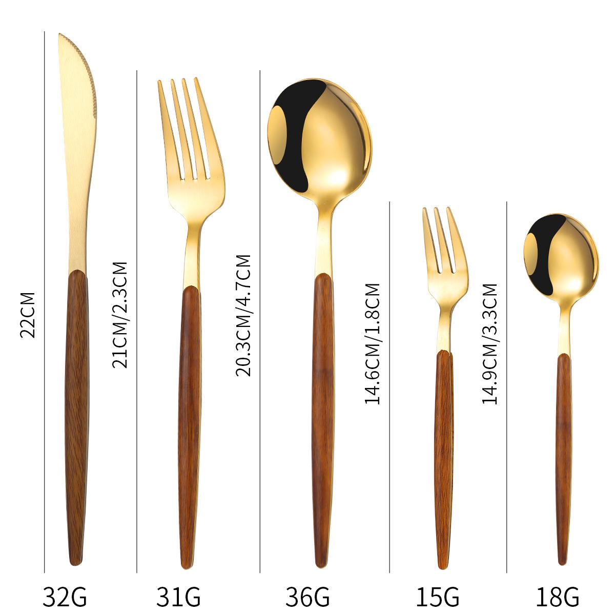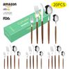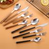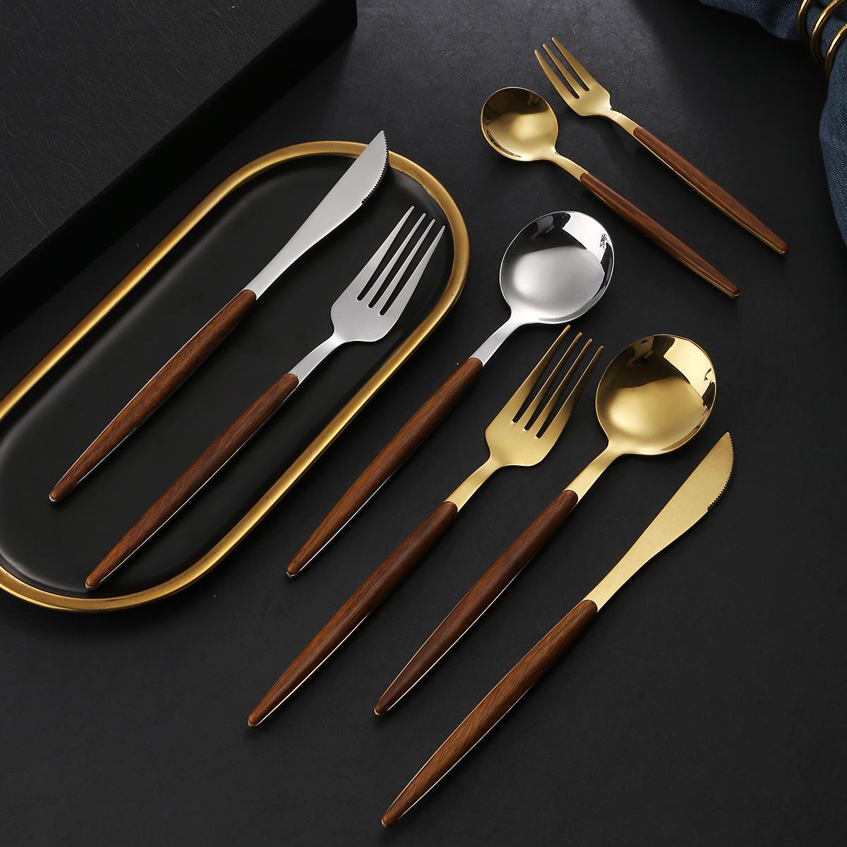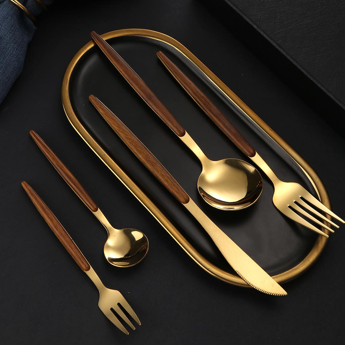 Nuevo juego de vajilla de acero inoxidable 430 de Amazon, cuchillo, tenedor y cuchara, 20 piezas, mango de madera de imitación, cuchillo, tenedor y cuchara para carne de hotel.
