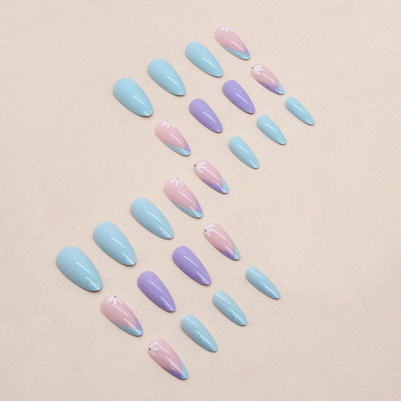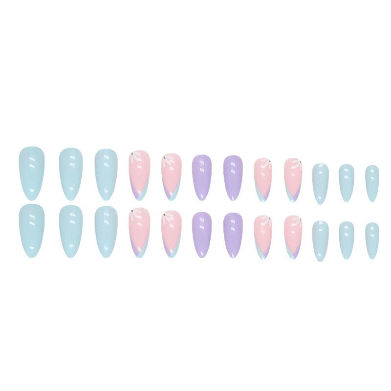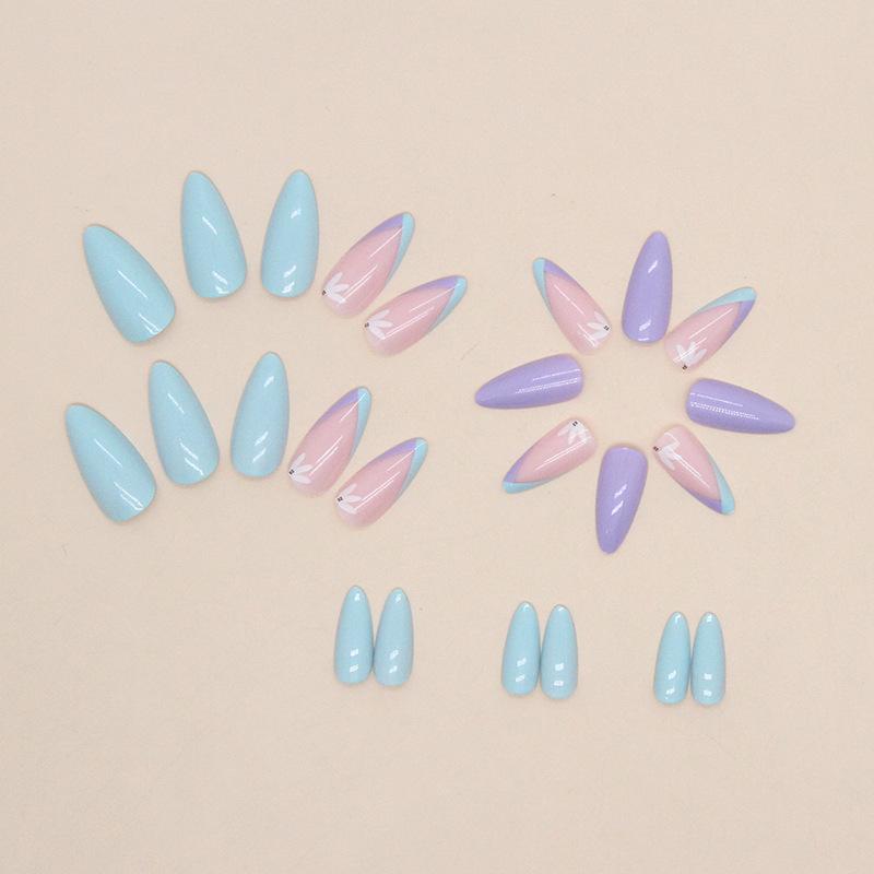 Uñas triangulares sencillas de estilo azul y morado con forma de media flor, estilo francés, con cabeza redonda y almendra, estilo europeo y americano.