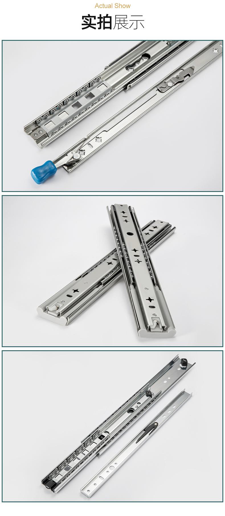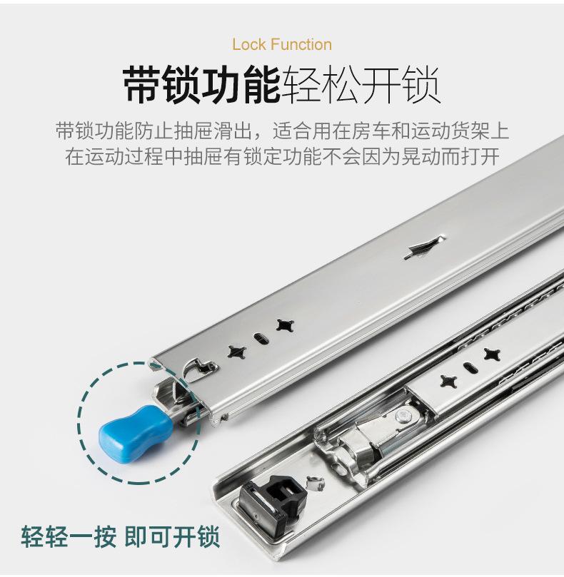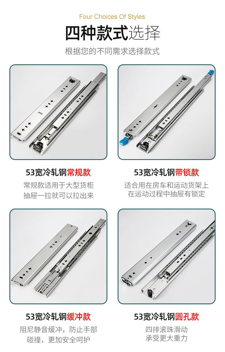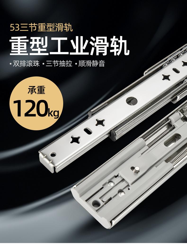 Riel deslizante de bolas de acero de tres secciones, engrosado, de alta resistencia, con cerradura, de 53 de ancho, para gabinete, cajón industrial RV, riel deslizante con soporte de carga