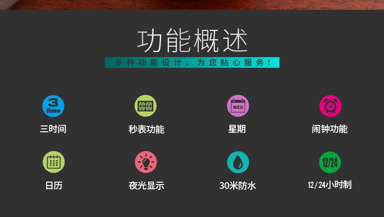 Funciones: tres horas, cronómetro, visualización de fecha, alarma con temporizador, día de la semana, luminoso, formato de 12/24 horas.