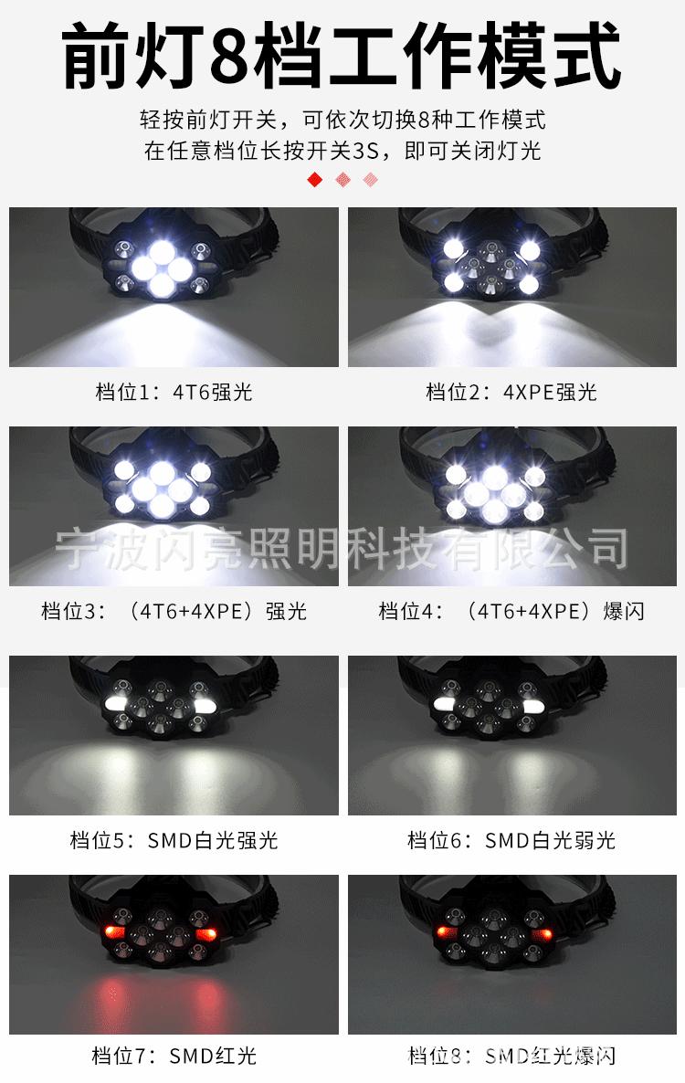 [Modo de trabajo]: 8º modo, 4T6 brillante, 4XPE brillante, 4T6+4XPE brillante4T6+4XPE parpadeando luces laterales luz blanca luz fuerte luz débil 2 luces de prueba luz roja luz roja brillante parpadeando