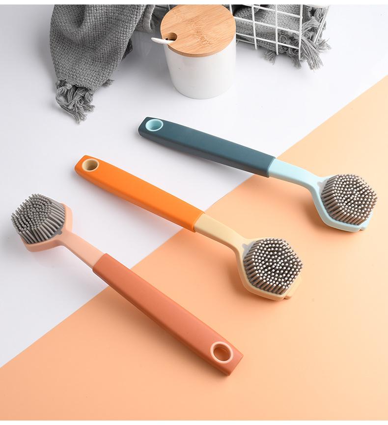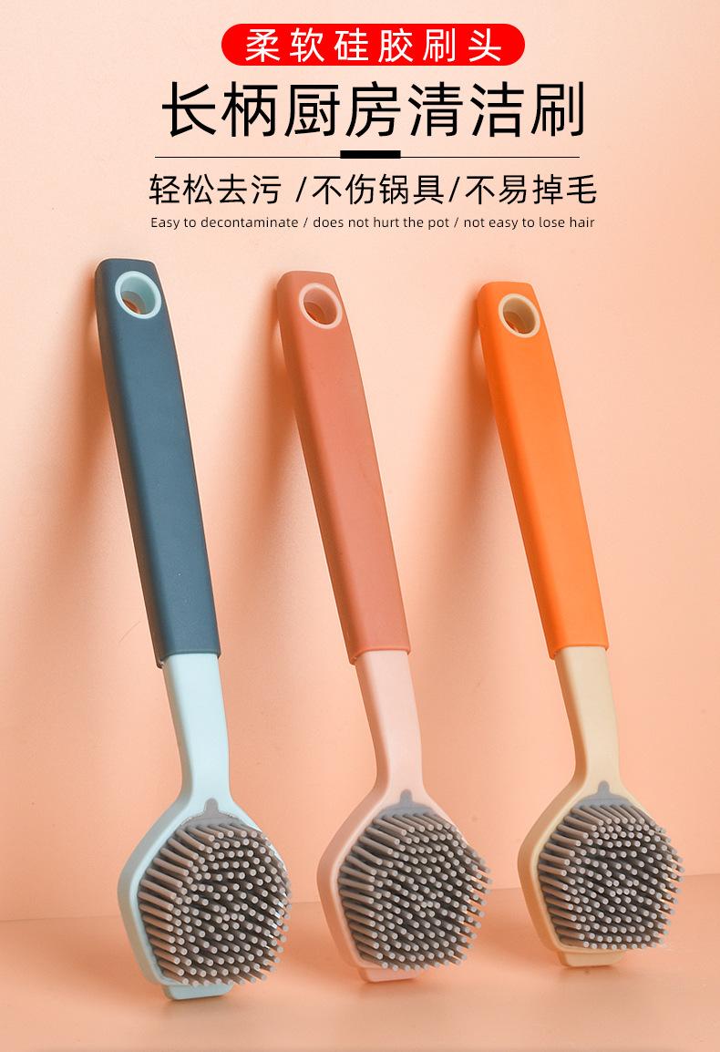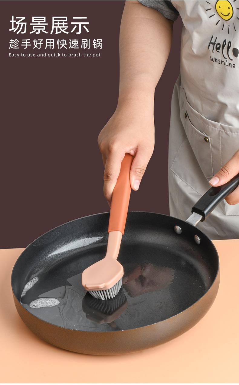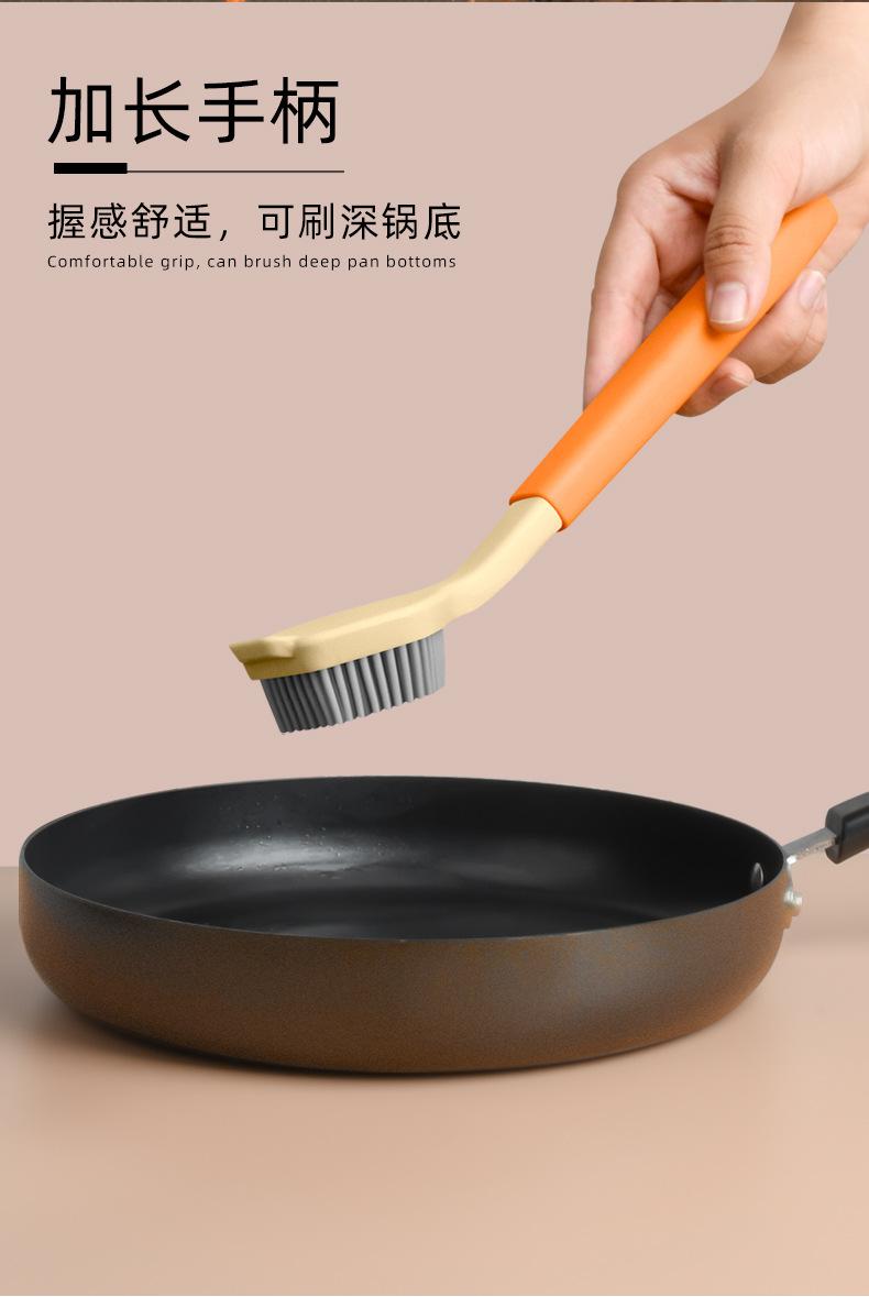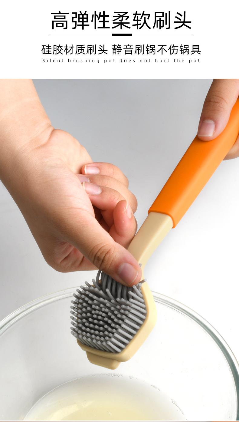 Cepillo de limpieza descontaminante para ollas de plástico con cerdas de silicona y mango largo, suave y antirayaduras.