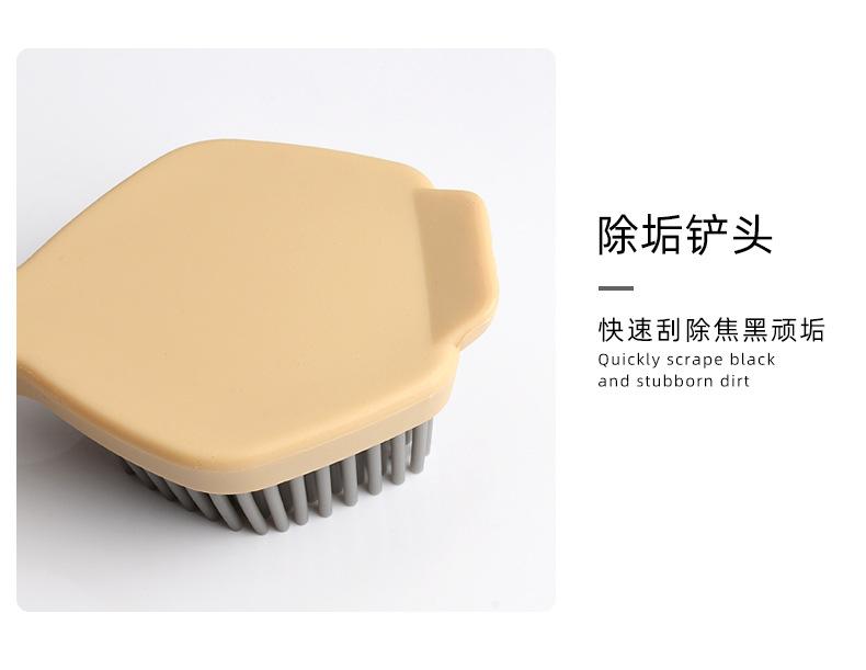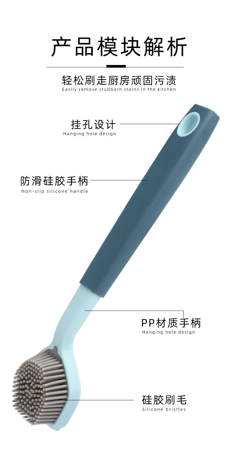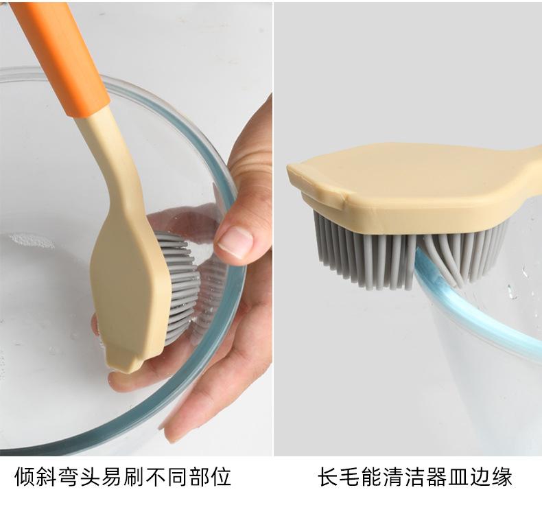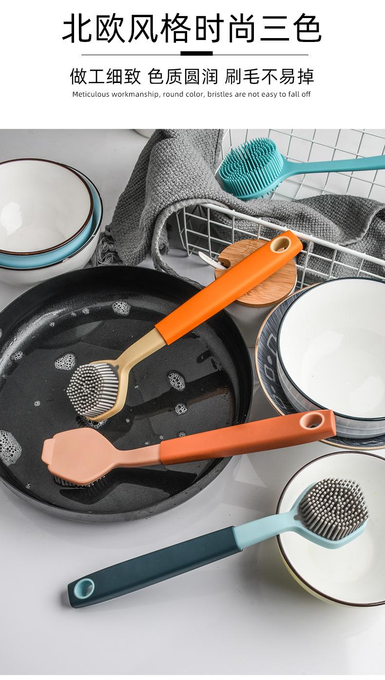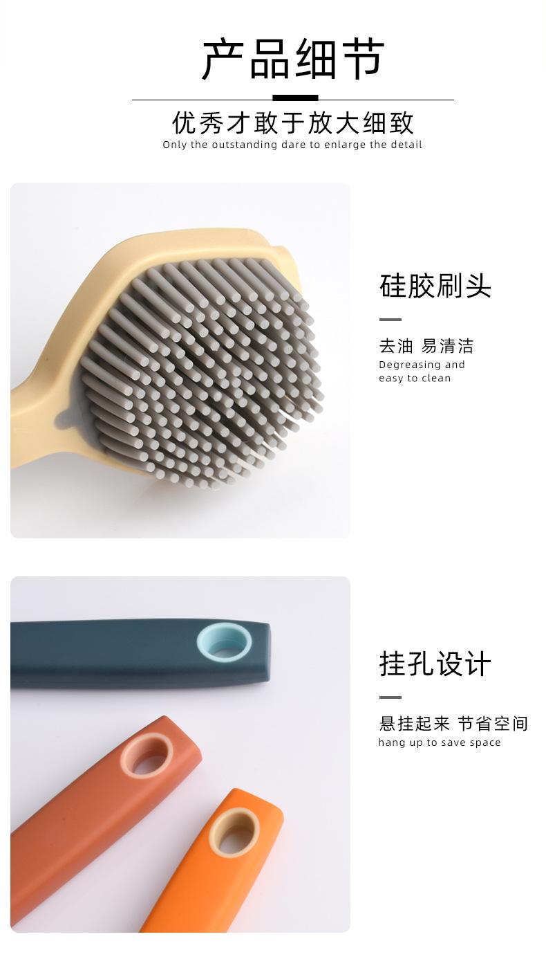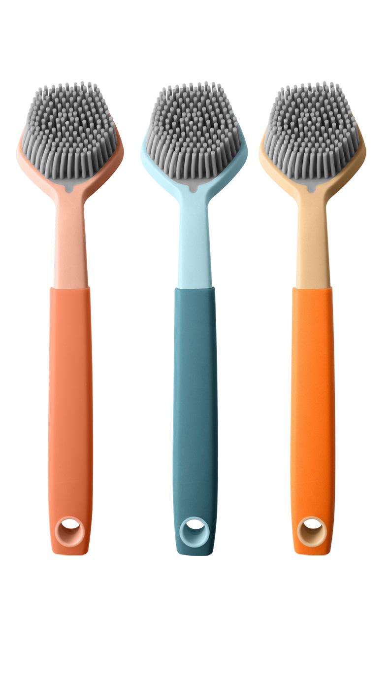 Cepillo de limpieza descontaminante para ollas de plástico con cerdas de silicona y mango largo, suave y antirayaduras.
