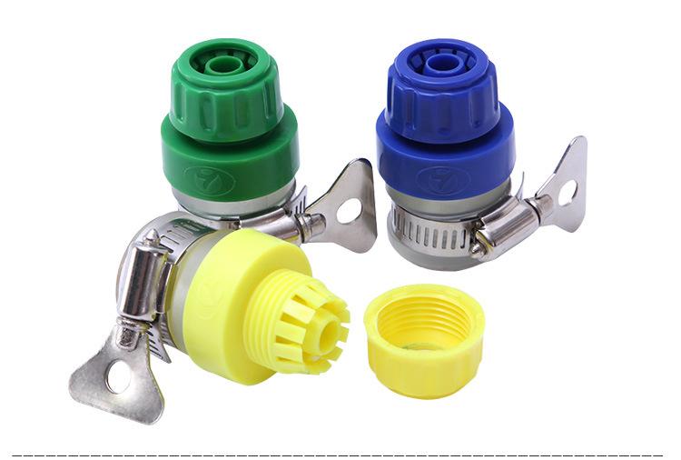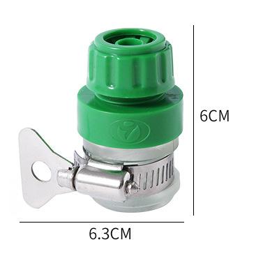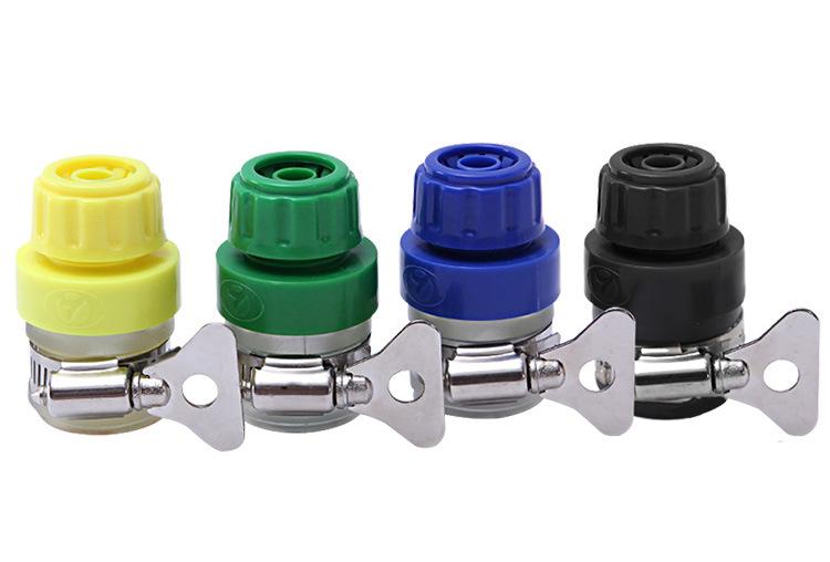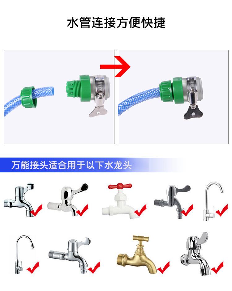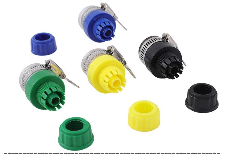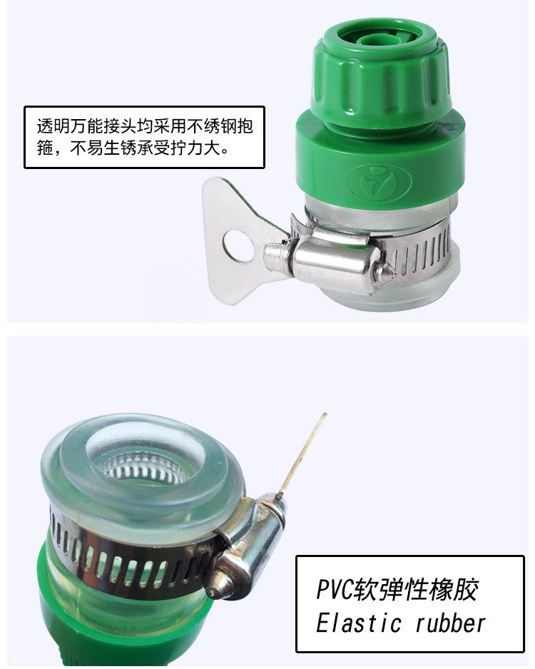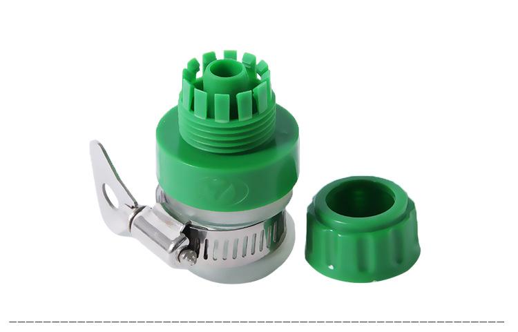 Conecte la pieza de goma negra directamente al grifo. Desenrosque la tuerca verde del otro lado y conecte la tubería de agua del lavadero a la boquilla. Asegúrese de introducir la tubería de agua lo máximo posible y, finalmente, apriete la tuerca verde. Al conectar la pieza de goma al grifo, afloje primero el aro de hierro, colóquelo en el grifo con fuerza y apriételo para fijarlo. El caucho natural negro tiene una textura suave y resistente que previene eficazmente las fugas de agua.