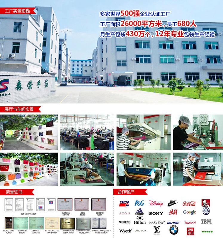 Guangzhou Senrong Handbag Intelligent Manufacturing Co., Ltd.Es una fábrica con 12 años de experiencia en producción, especializada en la fabricación de neceseres, maletas con ruedas, organizadores de viaje, bolsas para guardar bolsos y bolsas dentro de bolsas. Actualmente cuenta con 680 empleados, un área de fábrica de 26,000 metros cuadrados y un volumen de producción mensual de 600,000 bolsas. La empresa ha pasado la inspección de fábrica SGS de Coca-Cola. La empresa fue incluida en la Lista de Empresas Centrales de un Solo Conjunto en 2010 y fue uno de los diez principales comerciantes en línea del mundo en 2011.